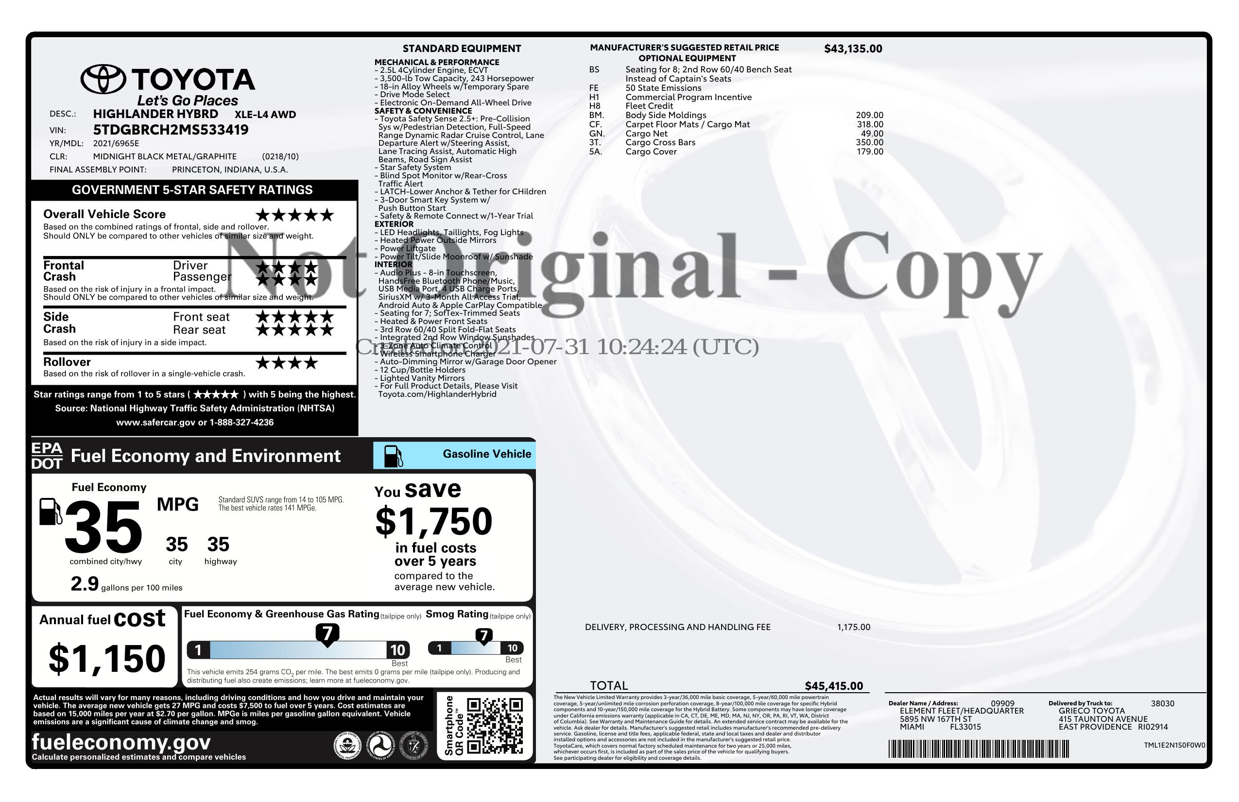 2021 Toyota Highlander Hybrid Xle Awd (Natl)