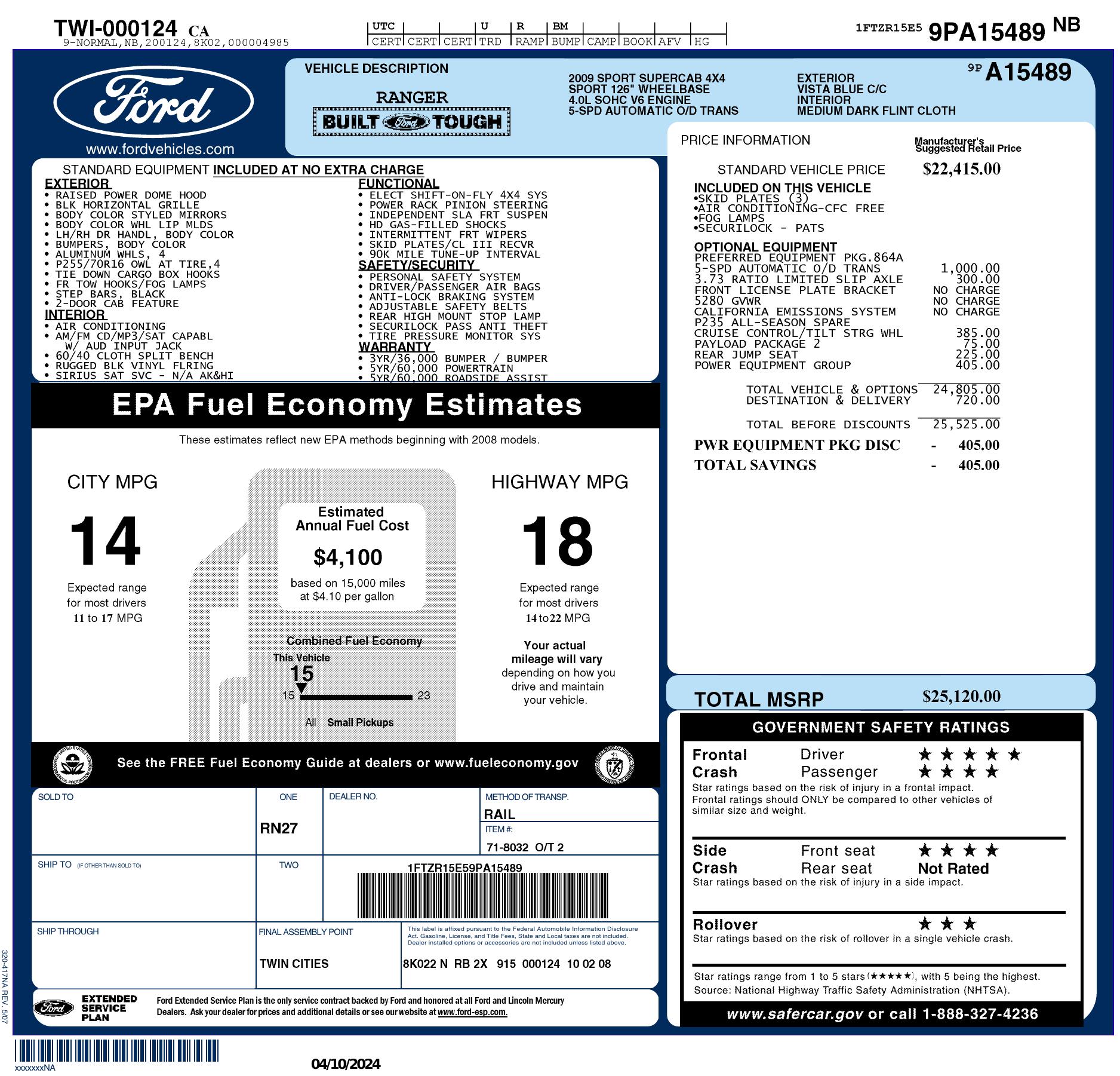 2009 Ford Ranger 4 Wd 2dr Super Cab 126"
