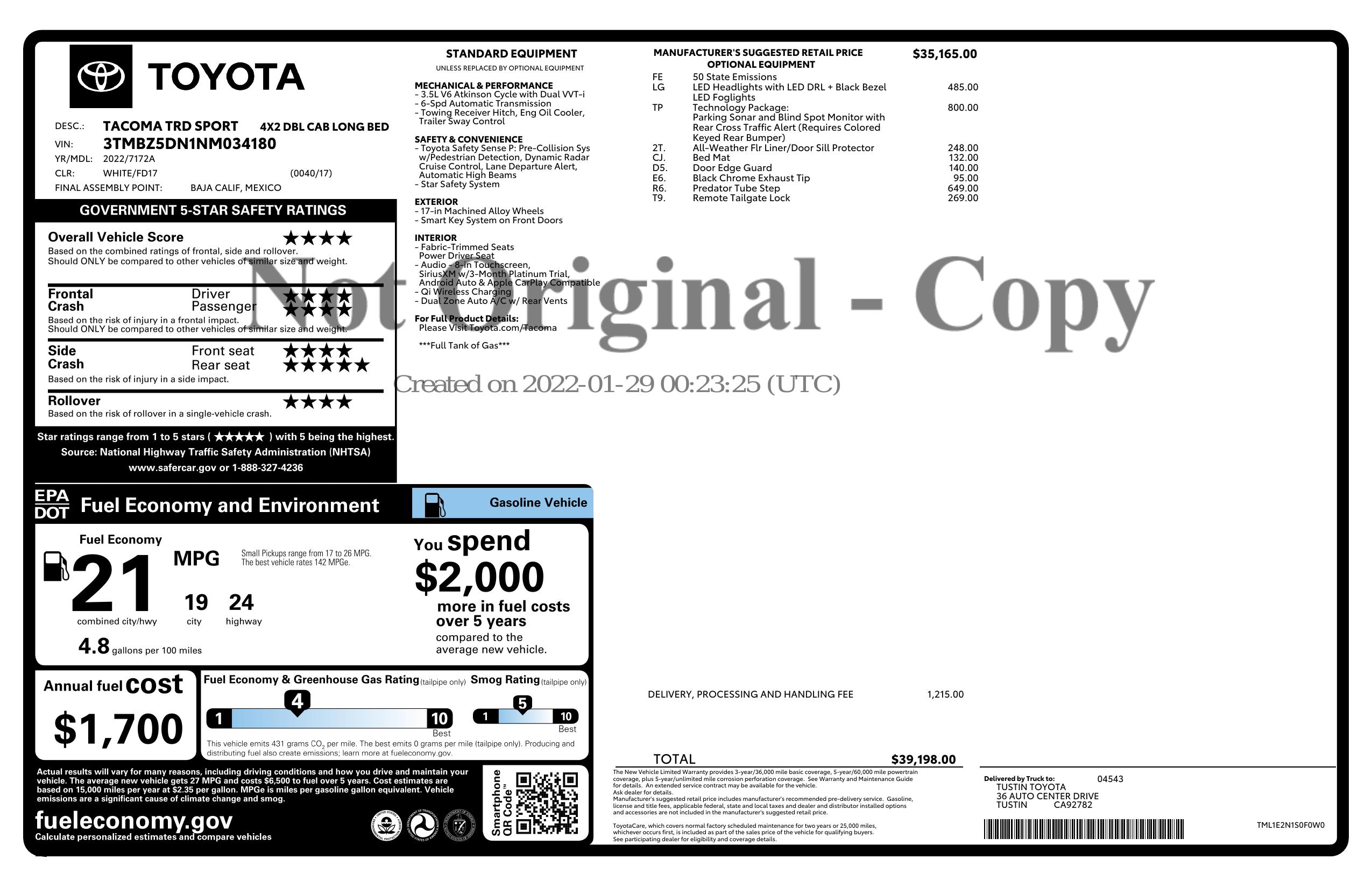 2022 Toyota Tacoma 2 Wd Double Cab 6' Bed V6 At (Natl)