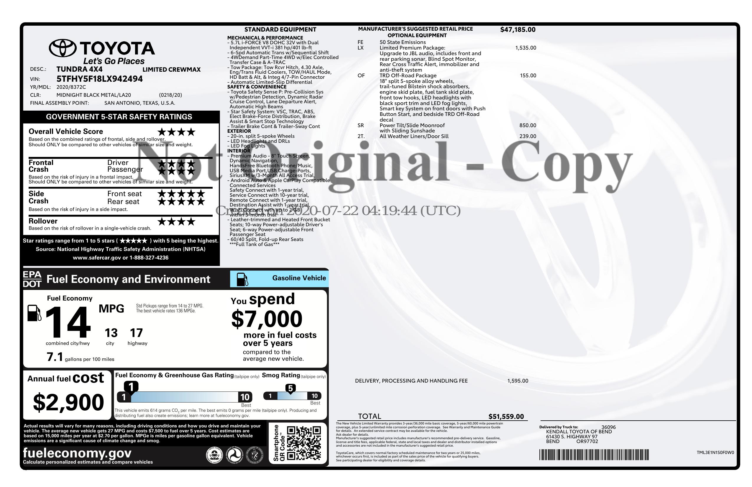 2020 Toyota Tundra 4 Wd Limited Crew Max 5.5' Bed 5.7 L (Natl)
