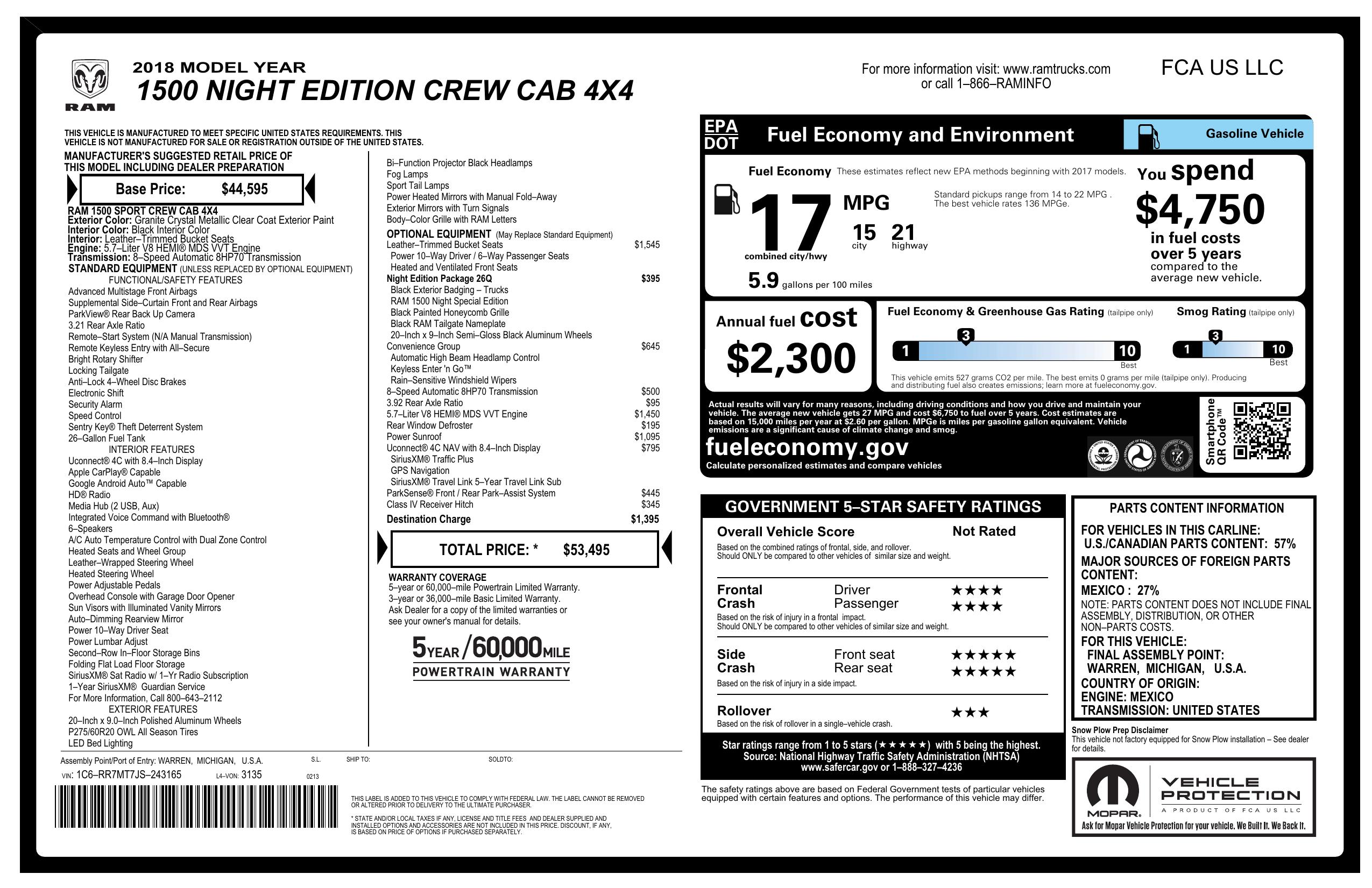2018 Ram 1500 Night 4x4 Crew Cab 5'7" Box *Ltd Avail*