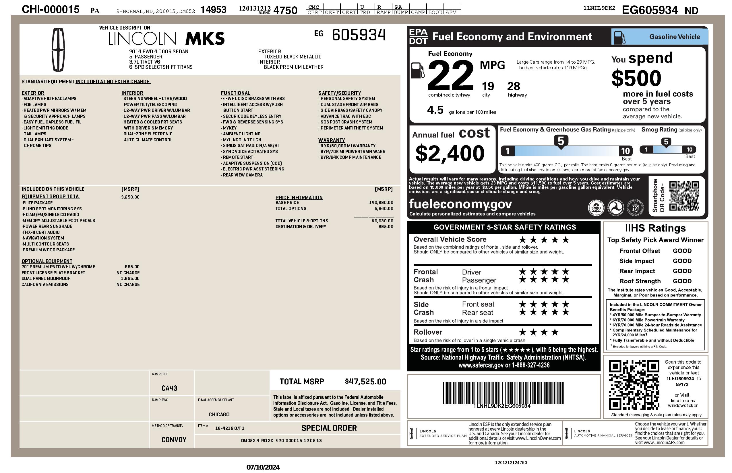 2014 Lincoln Mks 4dr Sdn 3.7 L Fwd