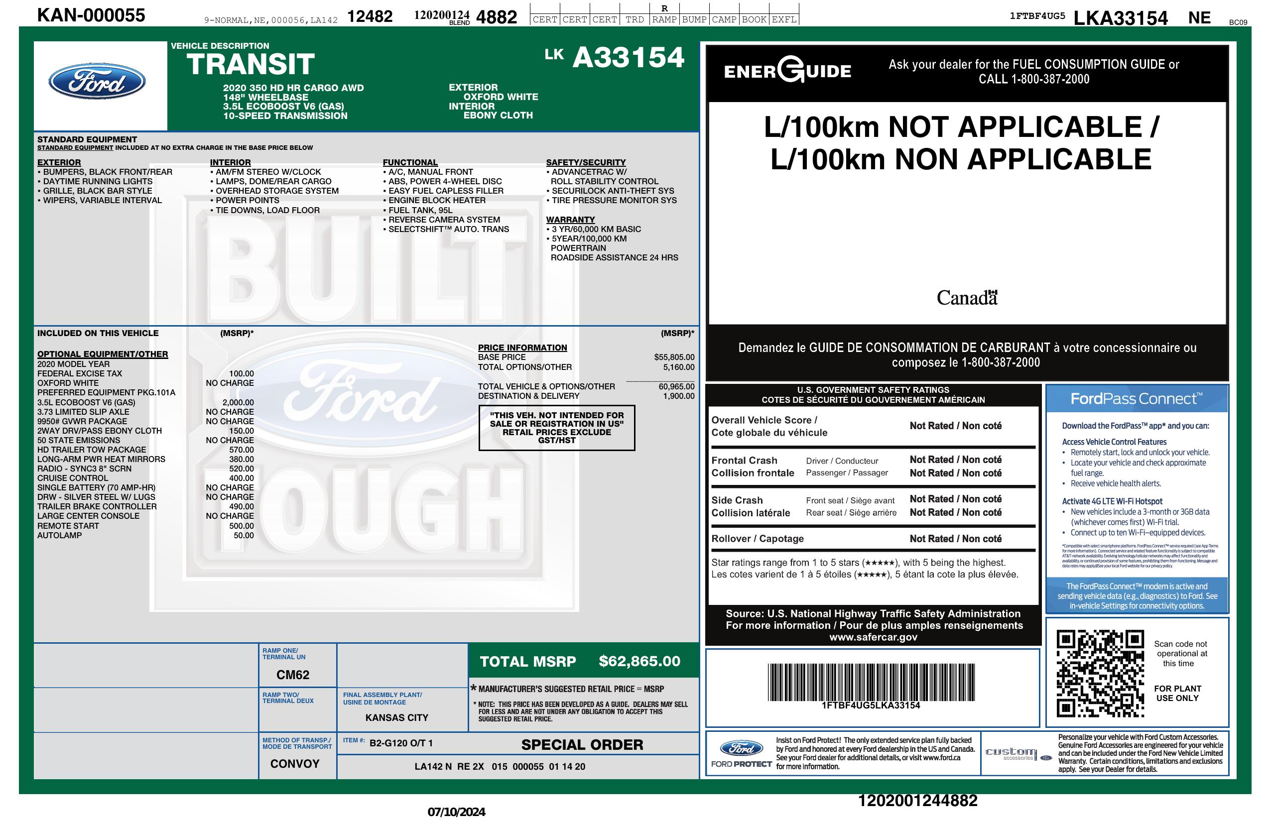 2020 Ford Transit Cargo Van T 350 Hd 148" El Hi Rf 9950 Gvwr Drw Awd