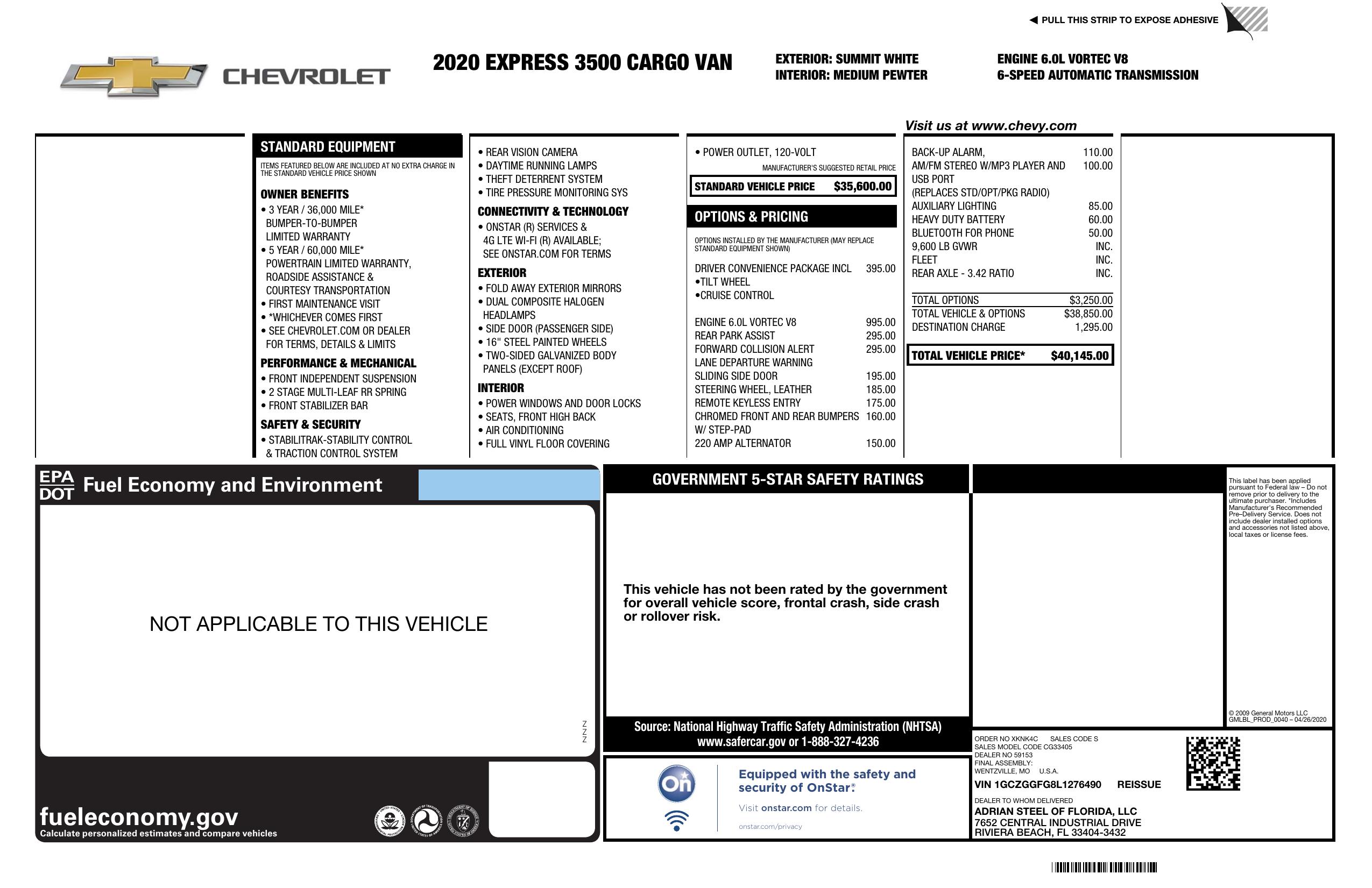 2020 Chevrolet Express Cargo Van Rwd 3500 135"