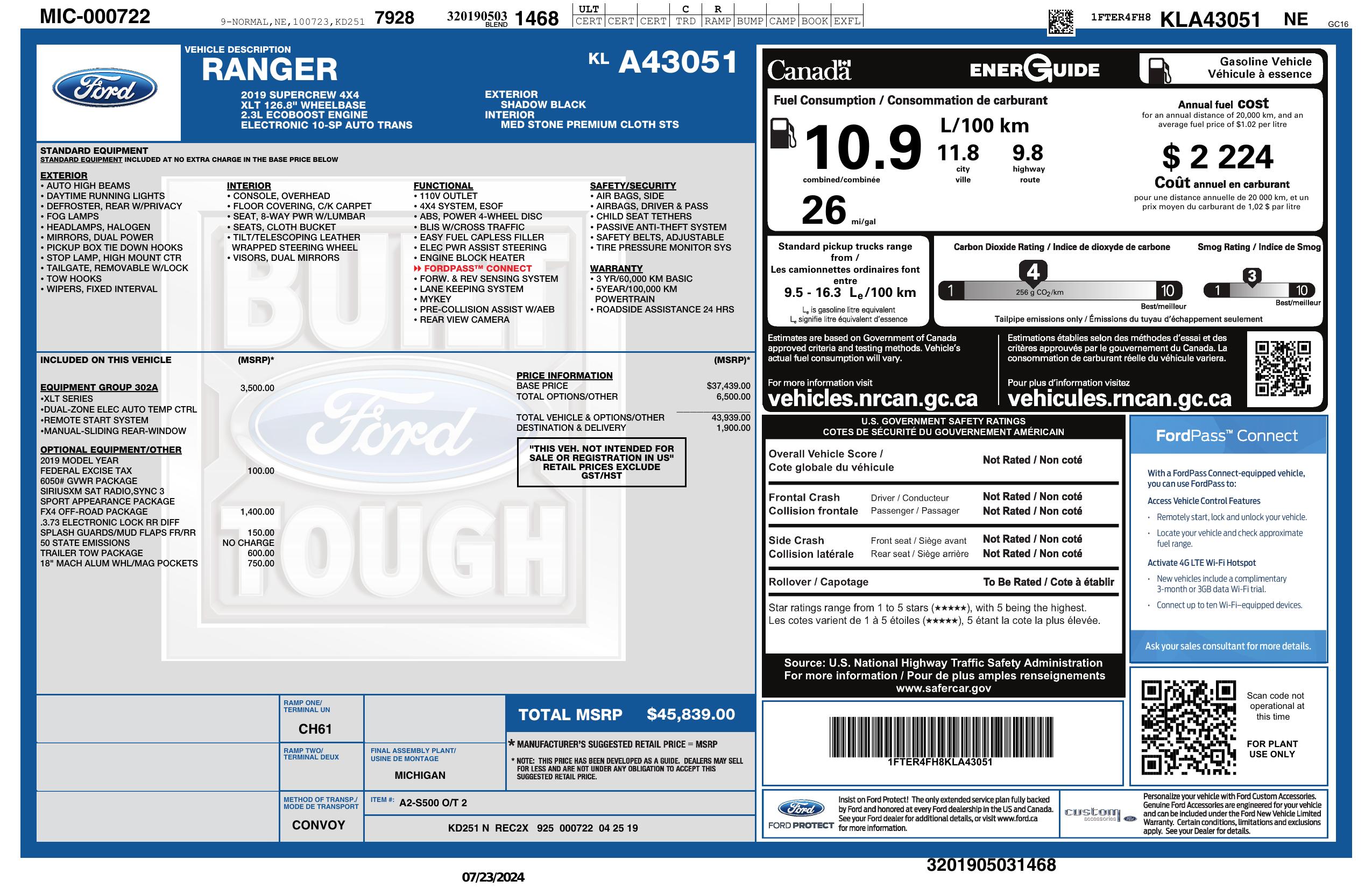 2019 Ford Ranger 4 Wd Super Crew 5' Box
