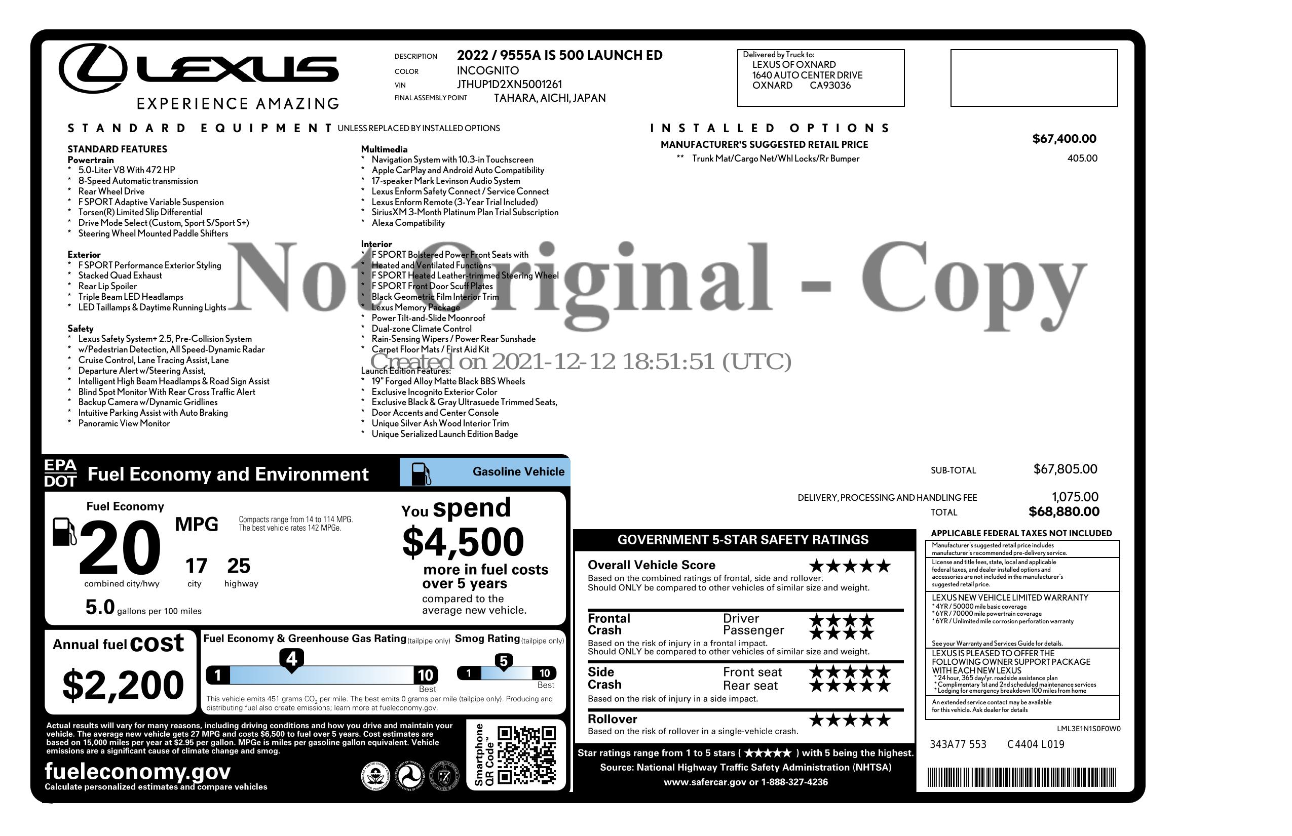 2022 Lexus Is Is 500 F Sport Performance Launch Edition Rwd