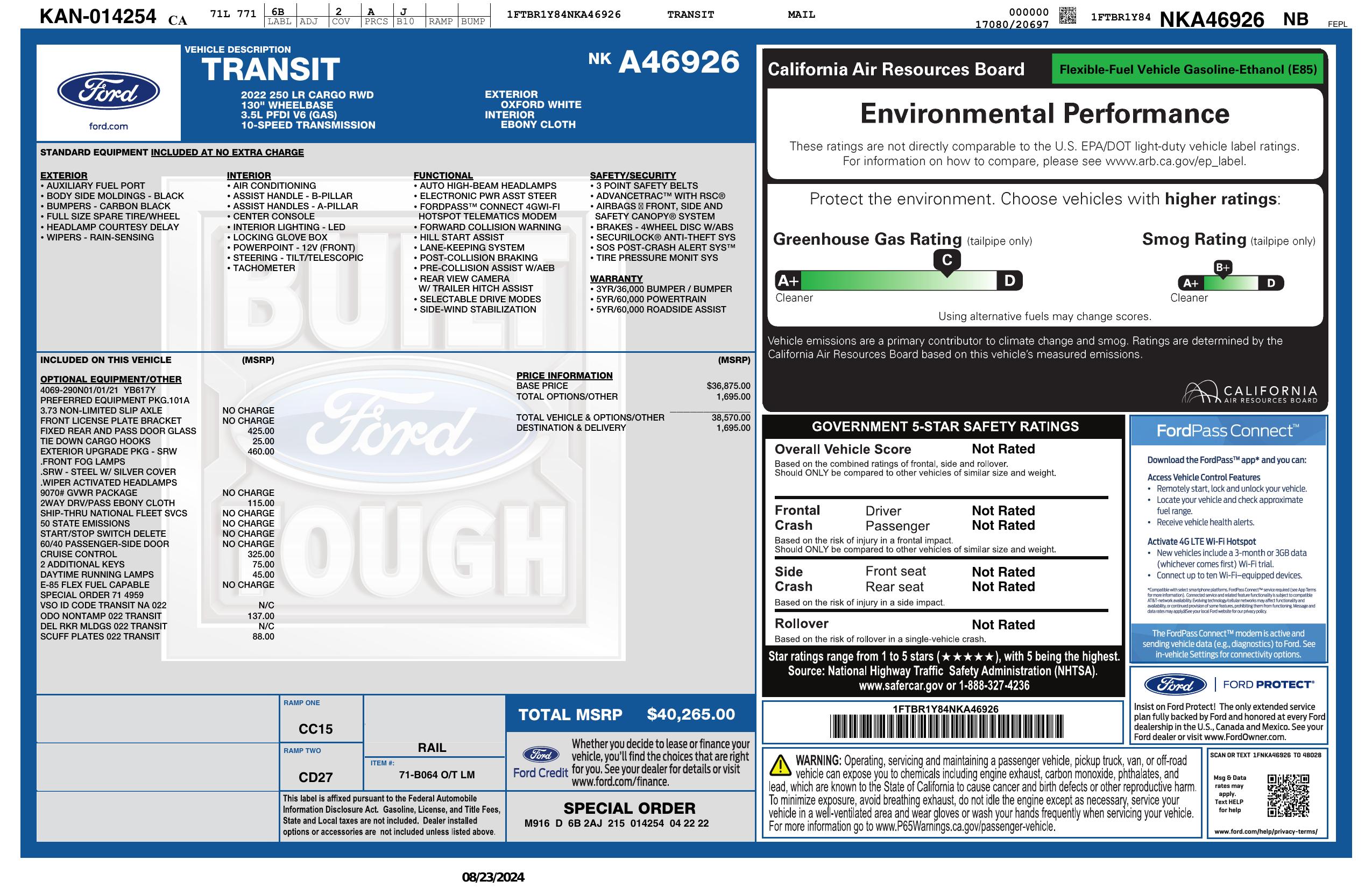 2022 Ford Transit Cargo Van T 250 Low Rf 9070 Gvwr Rwd
