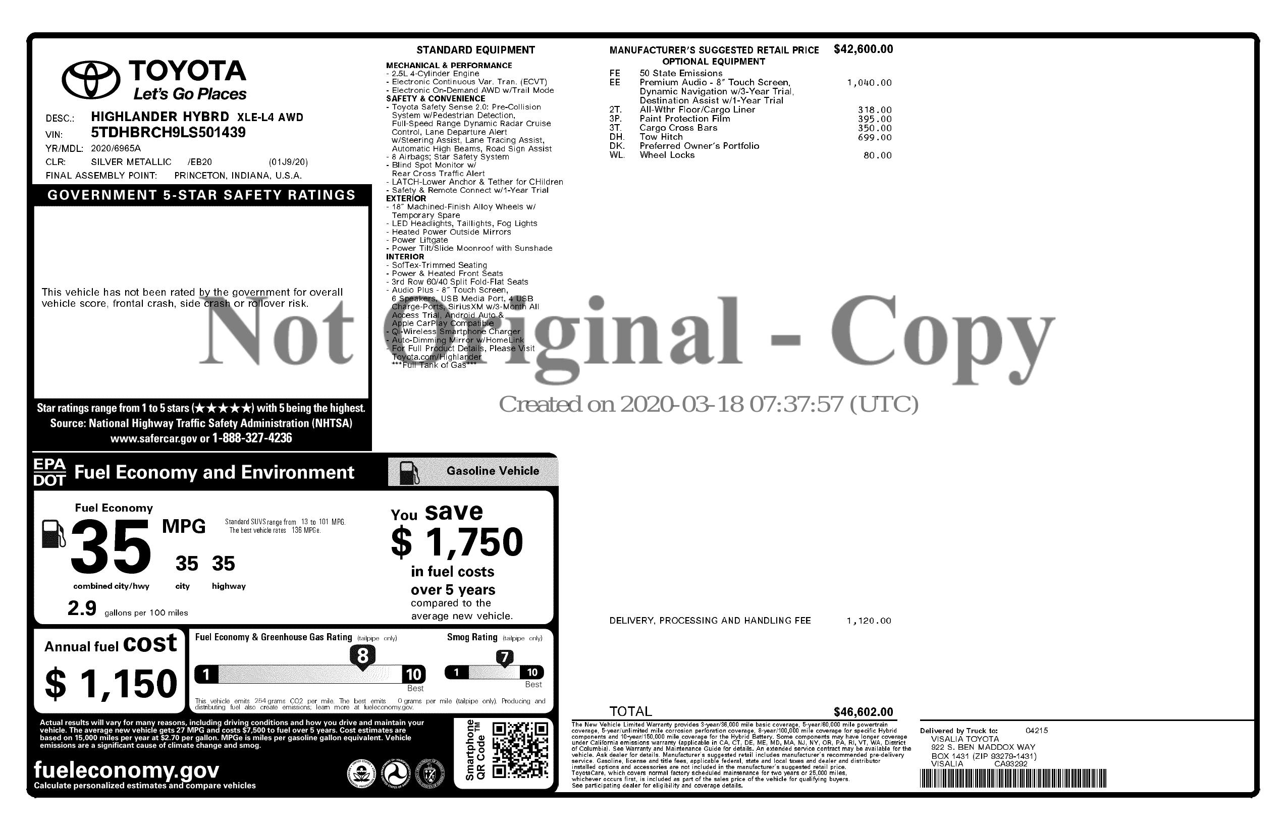 2020 Toyota Highlander Hybrid Xle Awd (Natl)