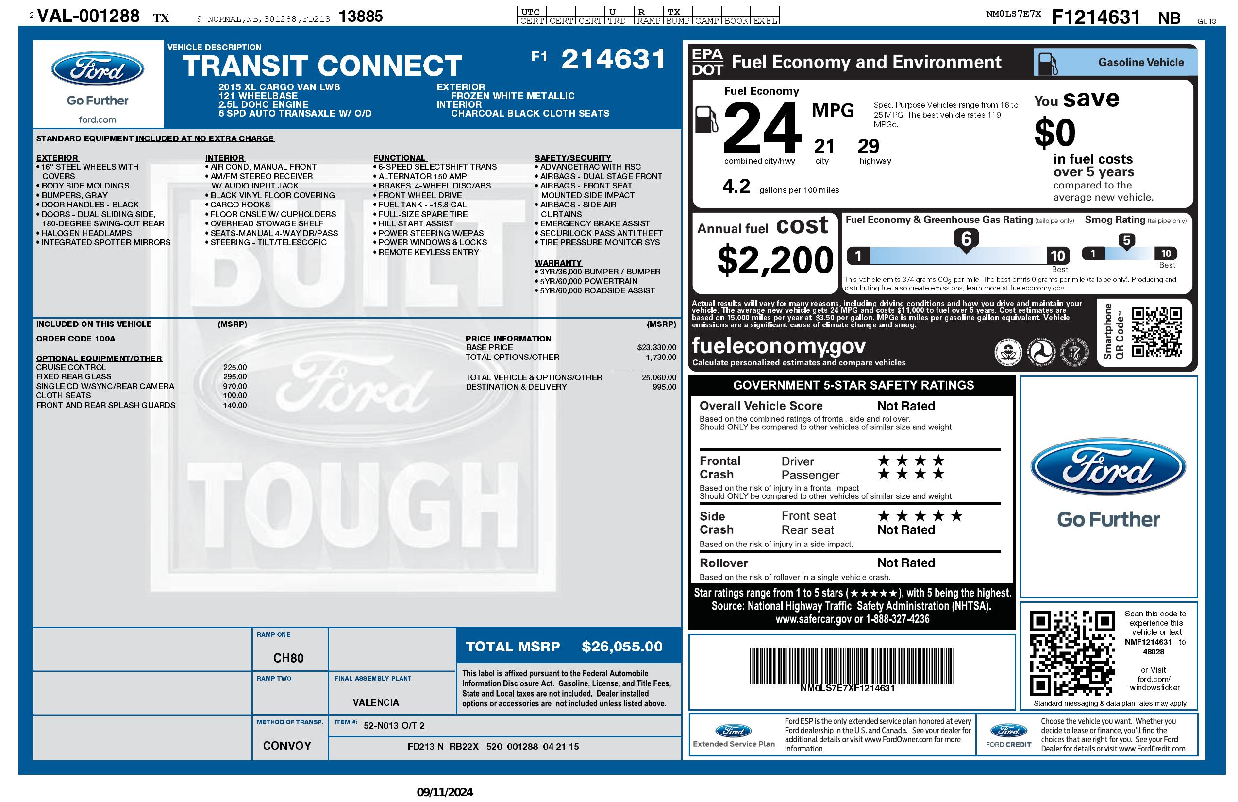 2015 Ford Transit Connect Xl 4dr Lwb Cargo Mini Van W/Rear Cargo Doors
