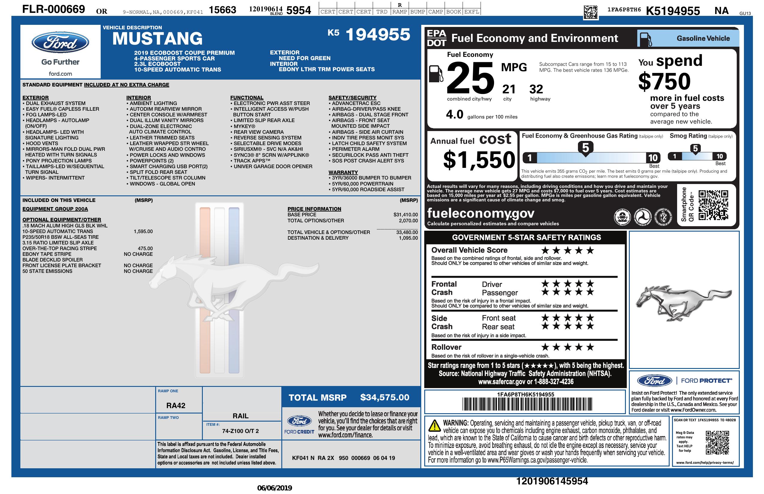 2019 Ford Mustang Eco Boost Premium 2dr Fastback