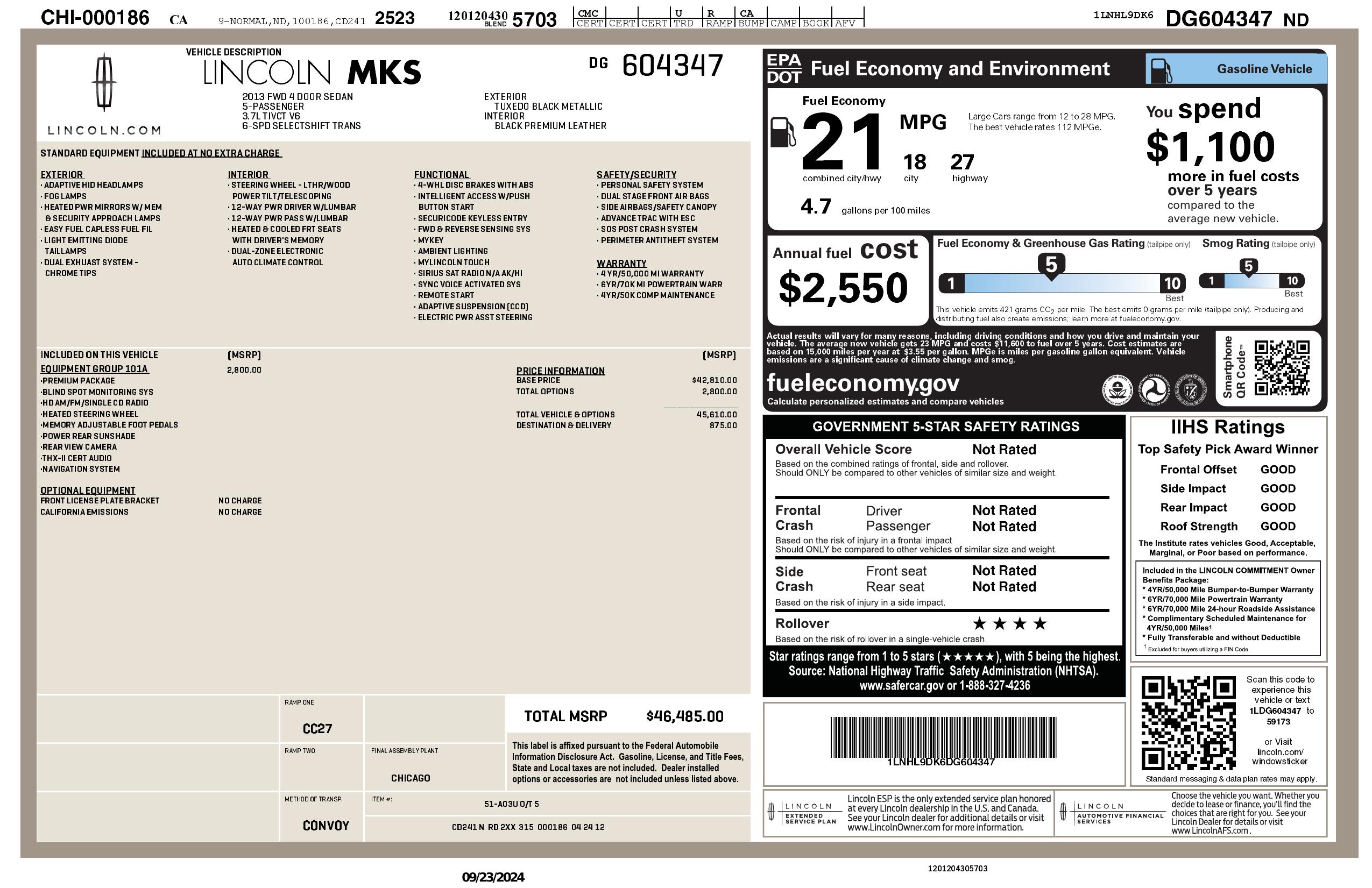 2013 Lincoln Mks 4dr Sdn 3.7 L Fwd