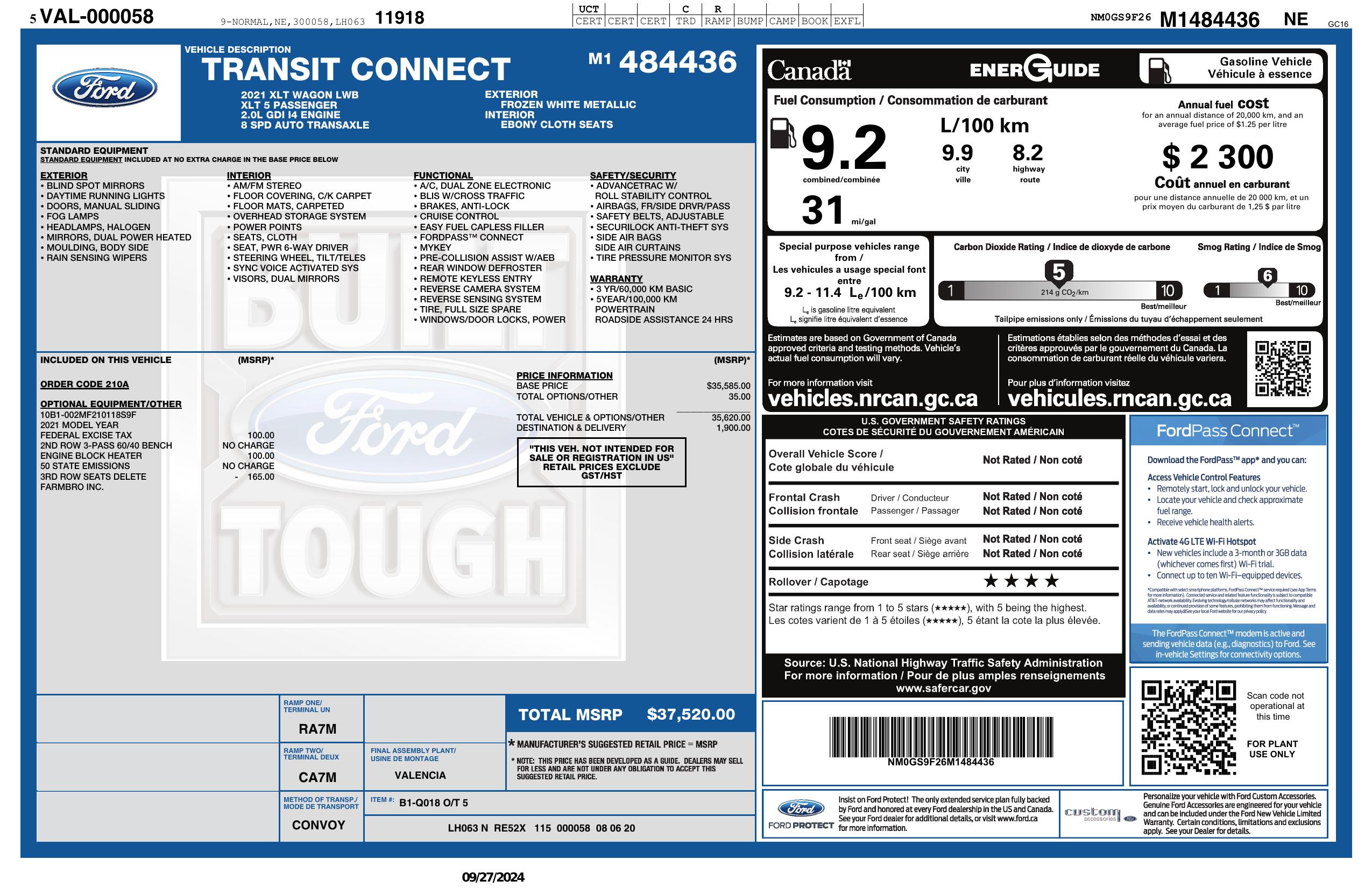 2021 Ford Transit Connect Wagon Xlt Lwb W/Rear Symmetrical Doors