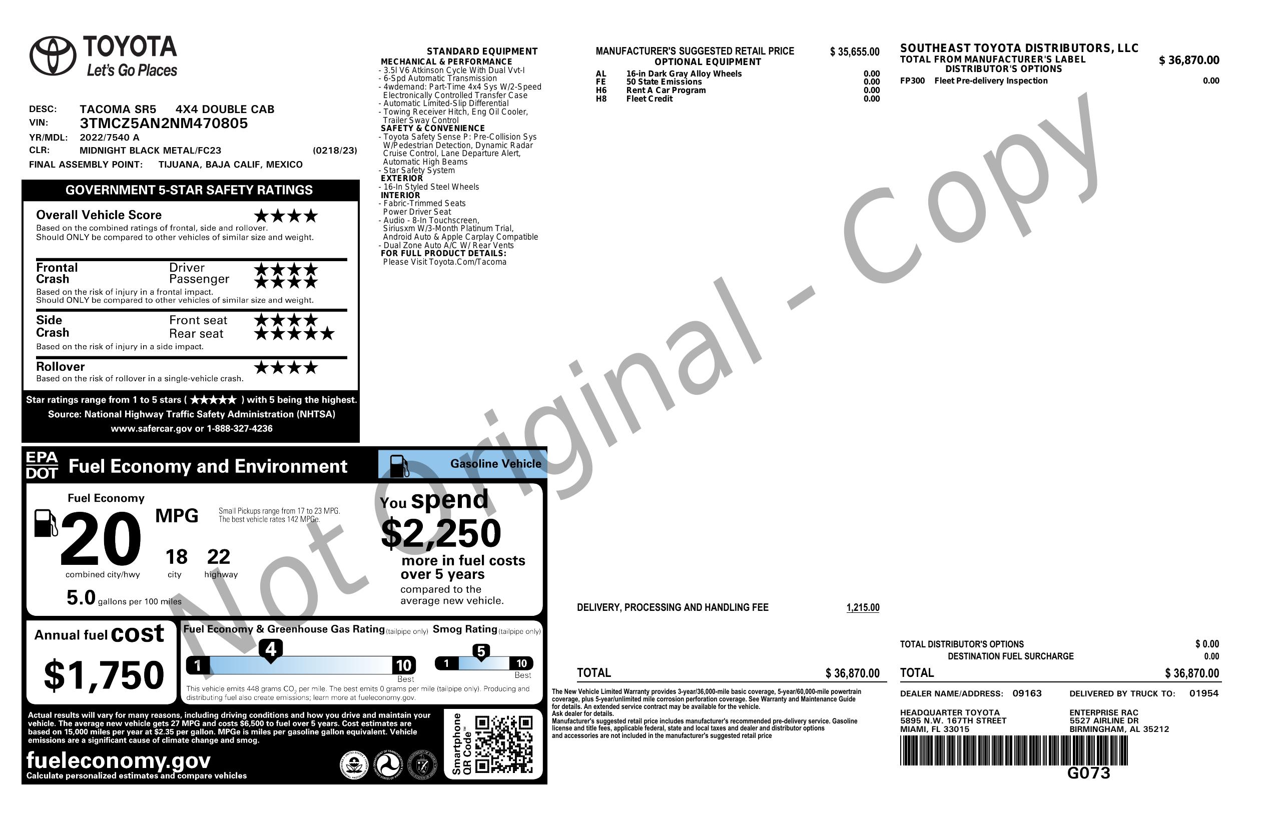 2022 Toyota Tacoma 4 Wd Double Cab 5' Bed V6 (Natl)