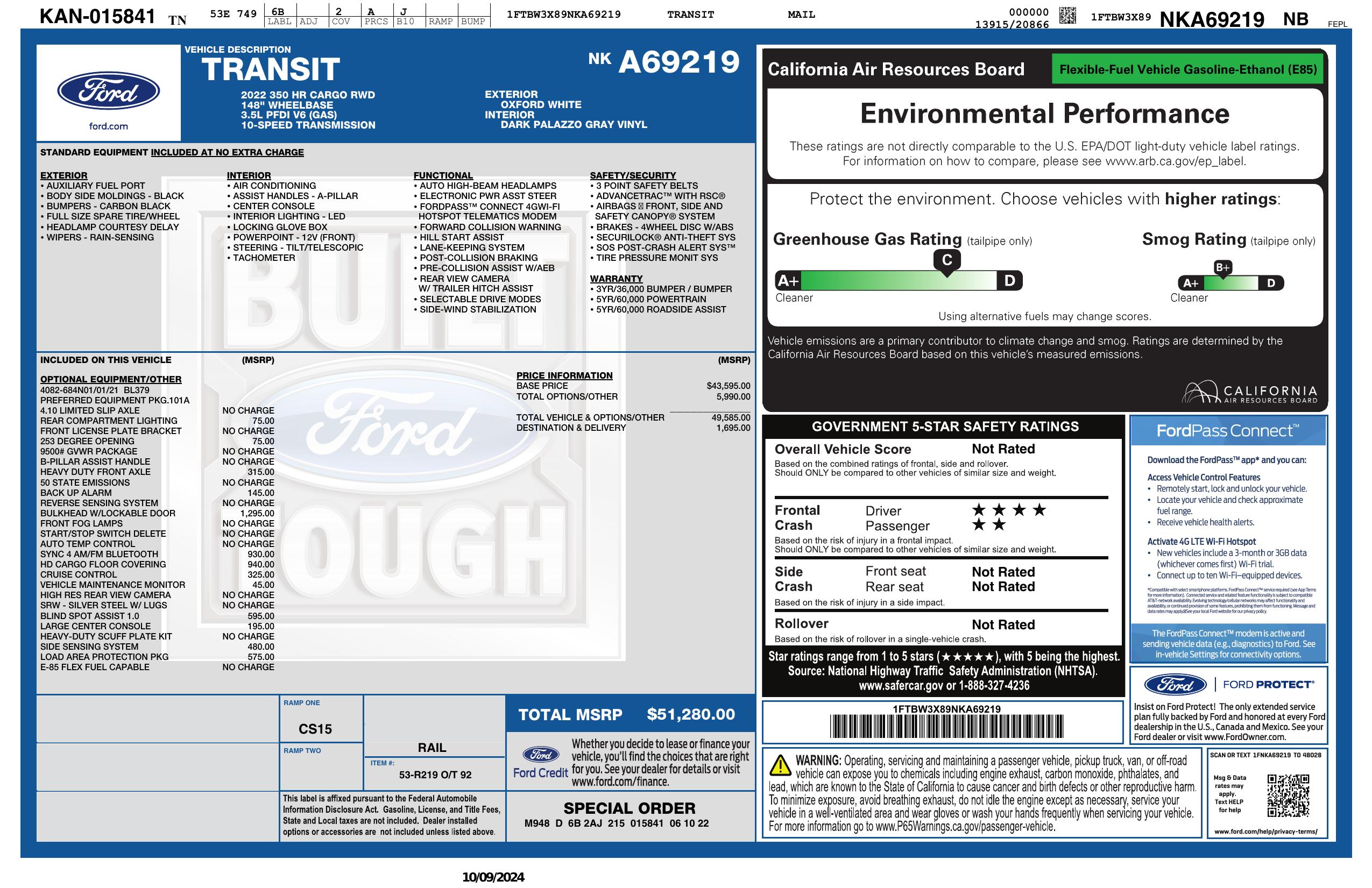 2022 Ford Transit Cargo Van T 350 148" El Hi Rf 9500 Gvwr Rwd