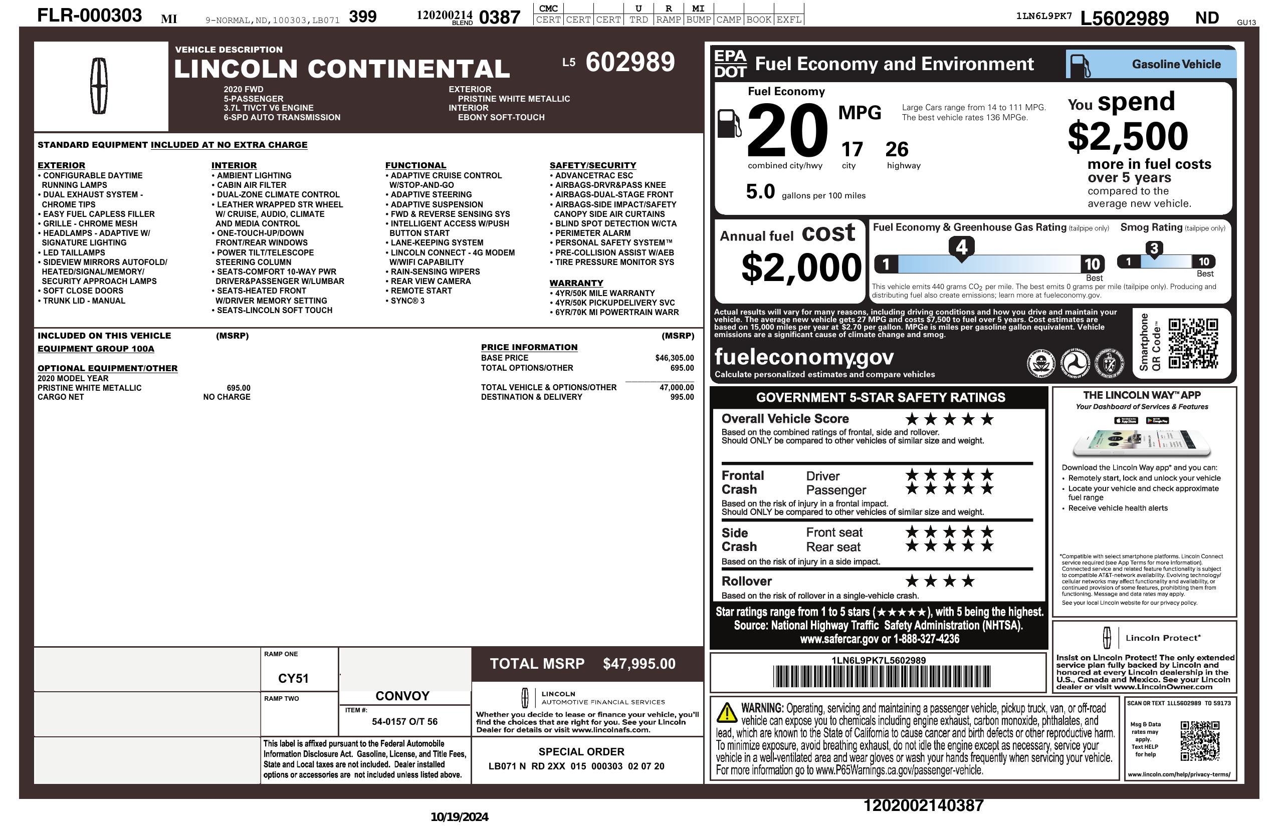2020 Lincoln Continental Standard Fwd