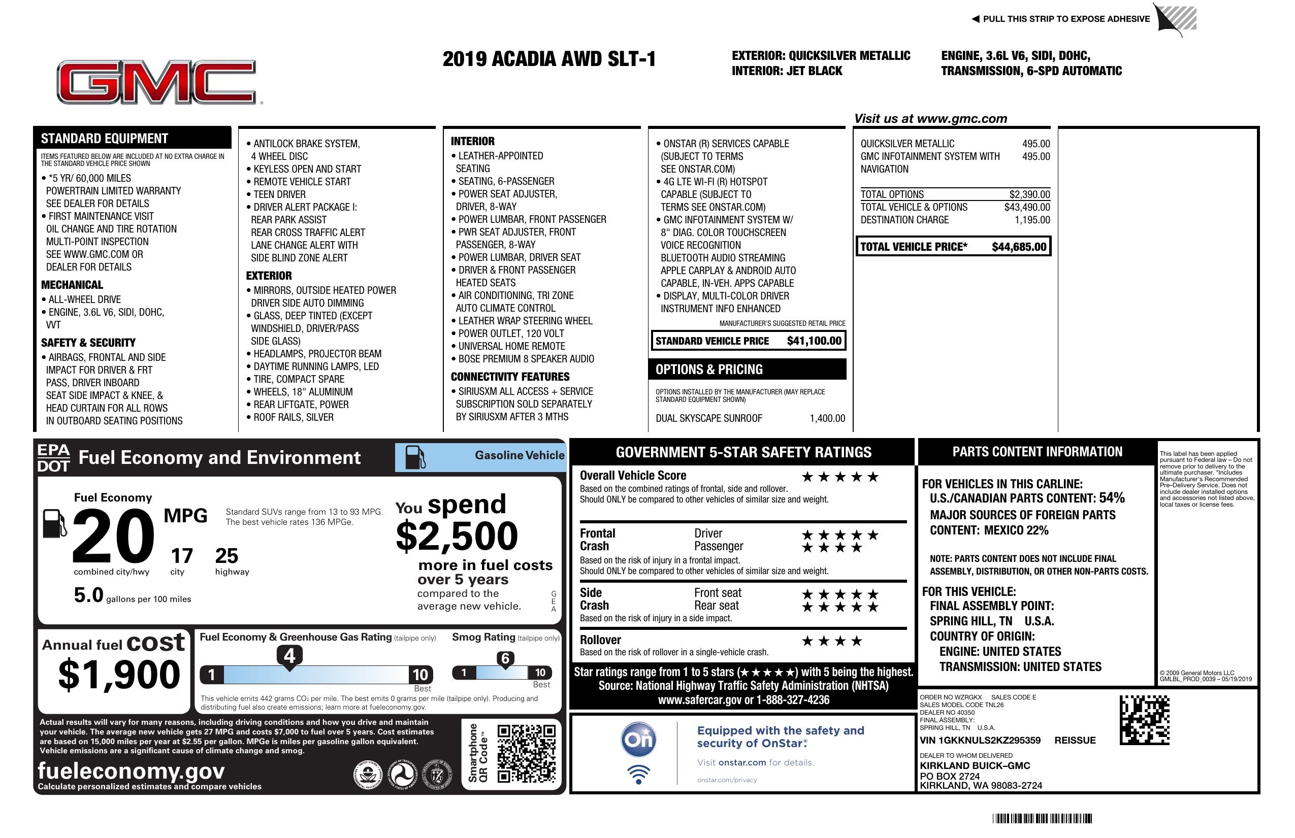 2019 GMC Acadia Awd 4dr Slt W/Slt 1