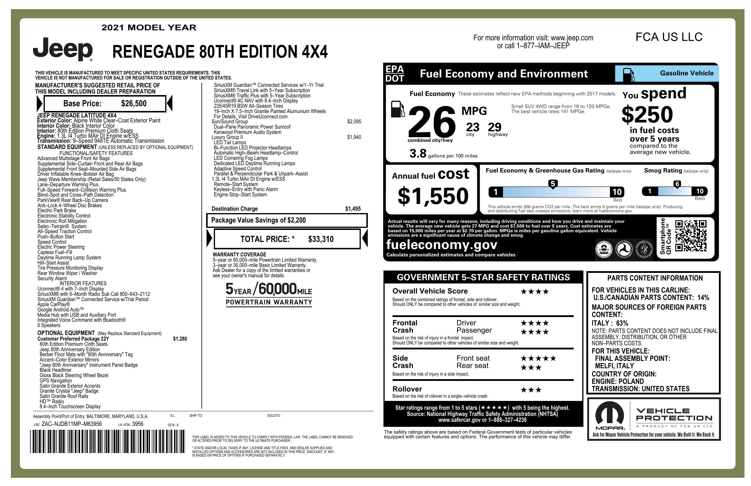 IMPORTANT NOTICE: The vehicle described above is a used vehicle. This Original Window Sticker was created by a third party vendor based on information set forth in the original new vehicle Monroney sticker. Dealer makes no representations or warranties, express or implied, as to the accuracy or reliability of the information in this window sticker, and is not responsible for any errors or omissions or missing, damaged, removed or third-party installed equipment/options. For current vehicle features and price, please review the Enterprise Car Sales website, the Used Car Buyer’s Guide and/or discuss with your Enterprise Car Sales dealership.