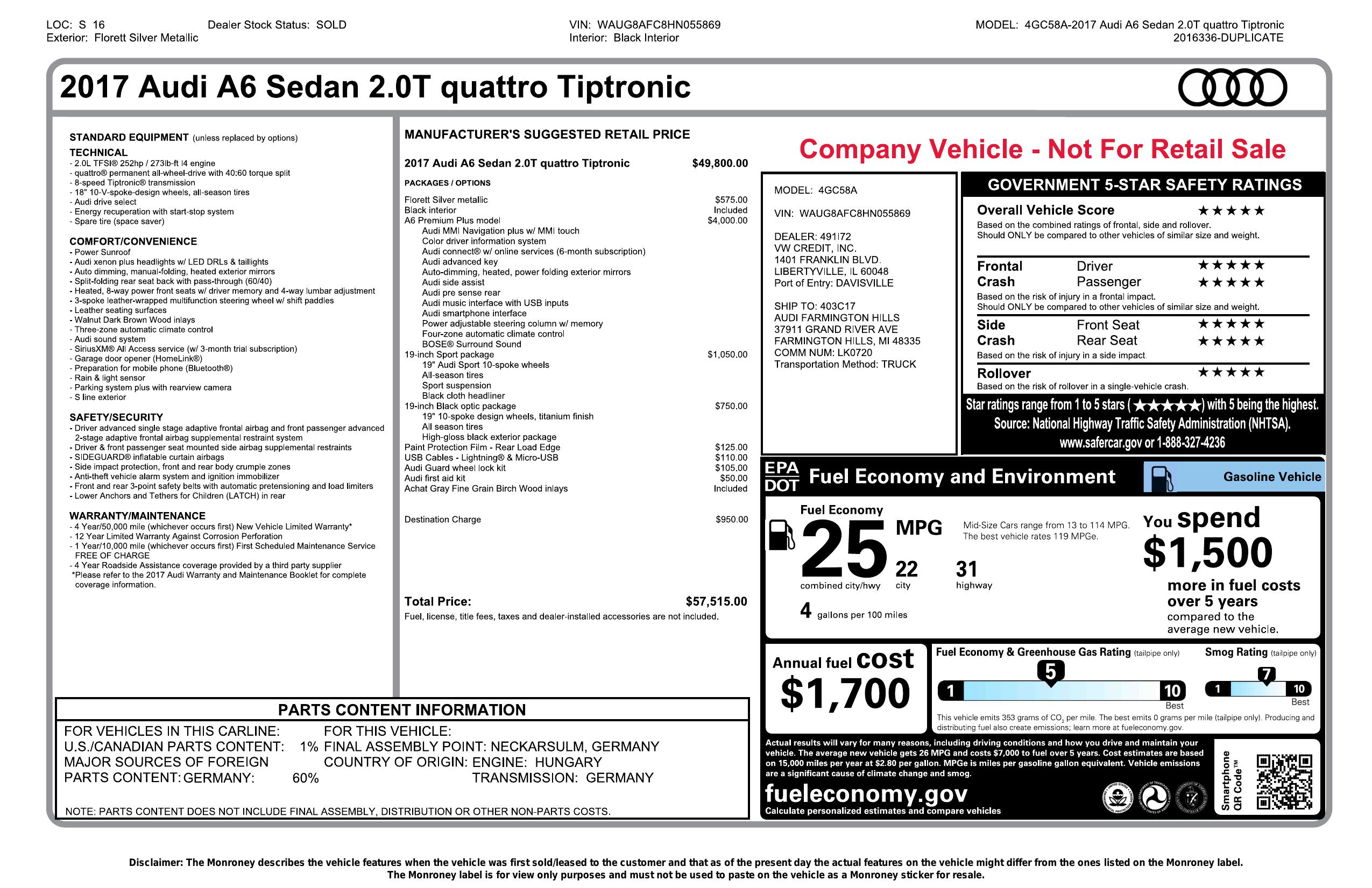 2017 Audi A6 2.0 Tfsi Premium Plus Quattro Awd