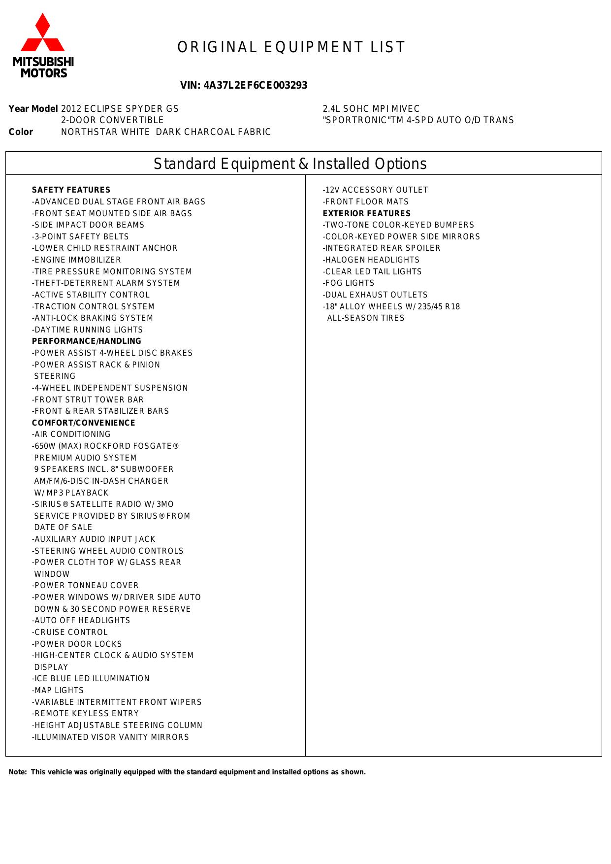 2012 Mitsubishi Eclipse 2dr Spyder Auto Gs Sport