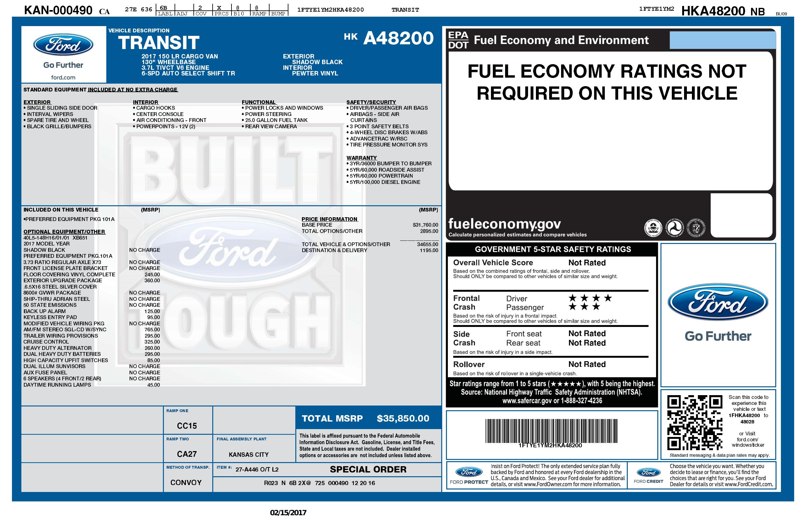 2017 Ford Transit Van T 150 130" Low Rf 8600 Gvwr Sliding Rh Dr