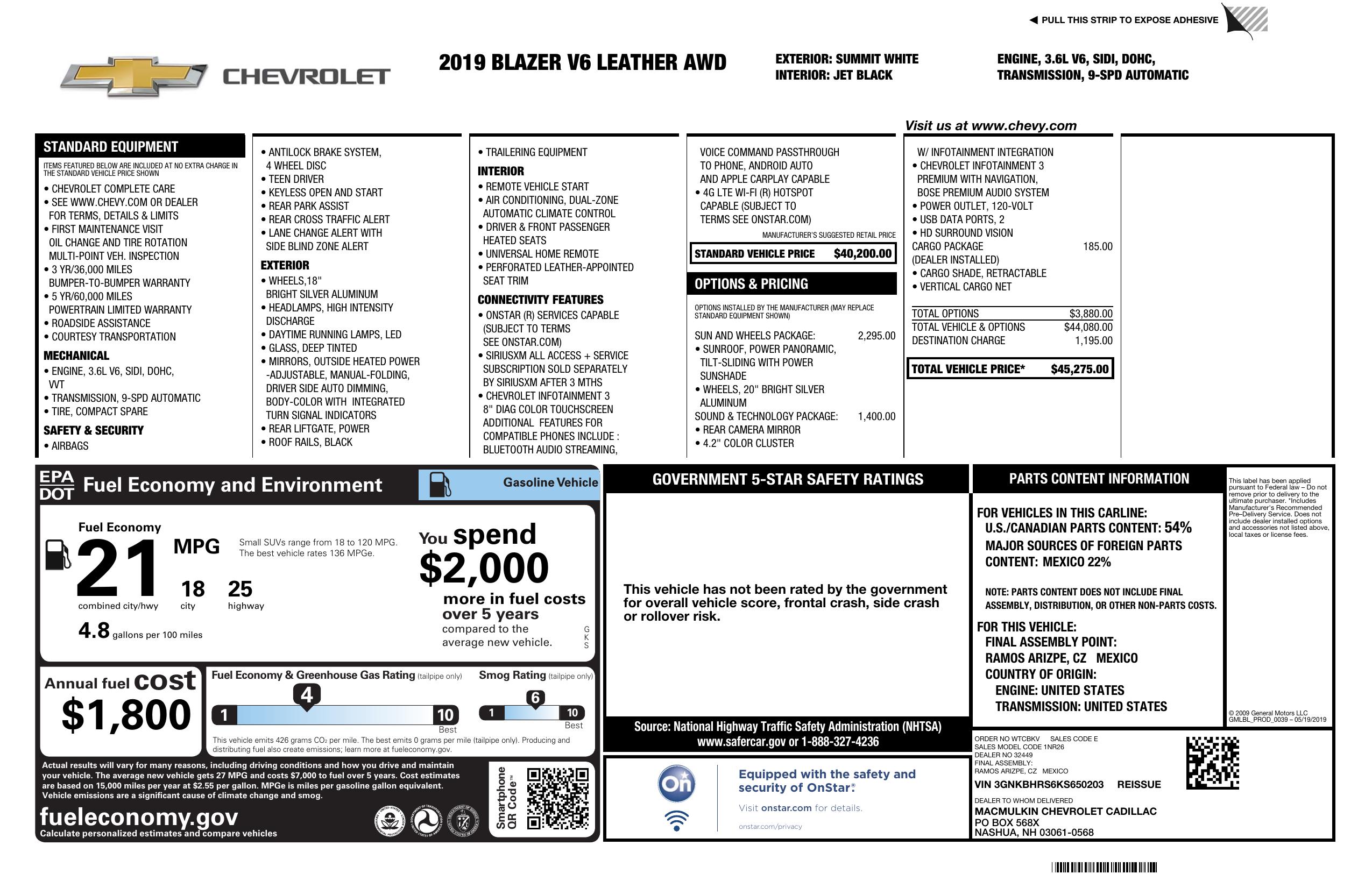 2019 Chevrolet Blazer Awd 4dr W/3 Lt