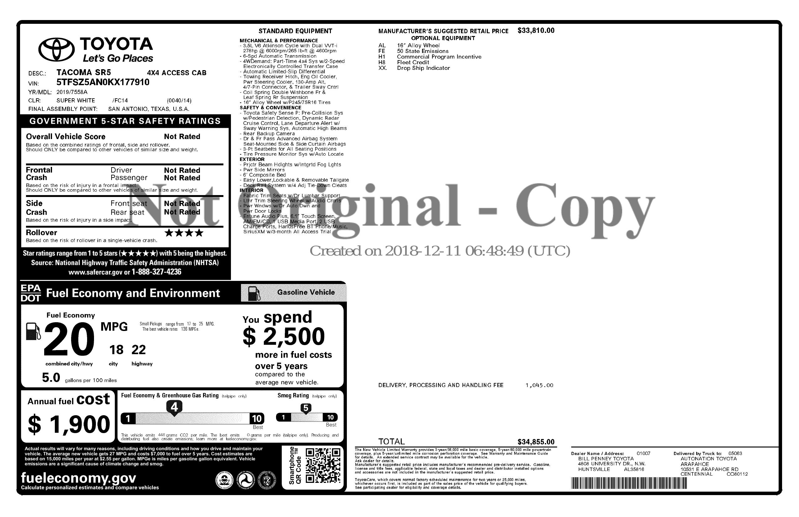 2019 Toyota Tacoma 4 Wd Access Cab 6' Bed V6 (Natl)