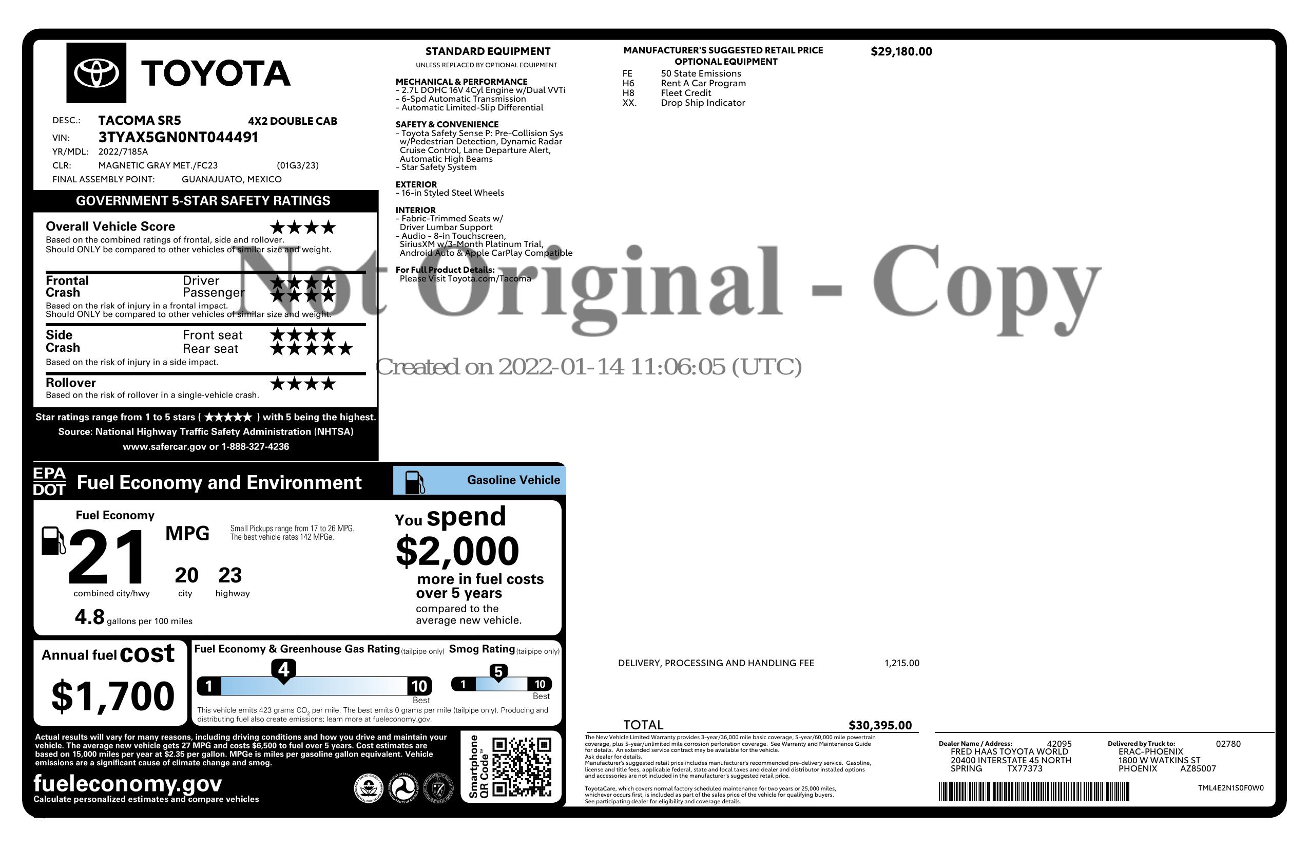 2022 Toyota Tacoma 2 Wd Double Cab 5' Bed I4 At (Natl)