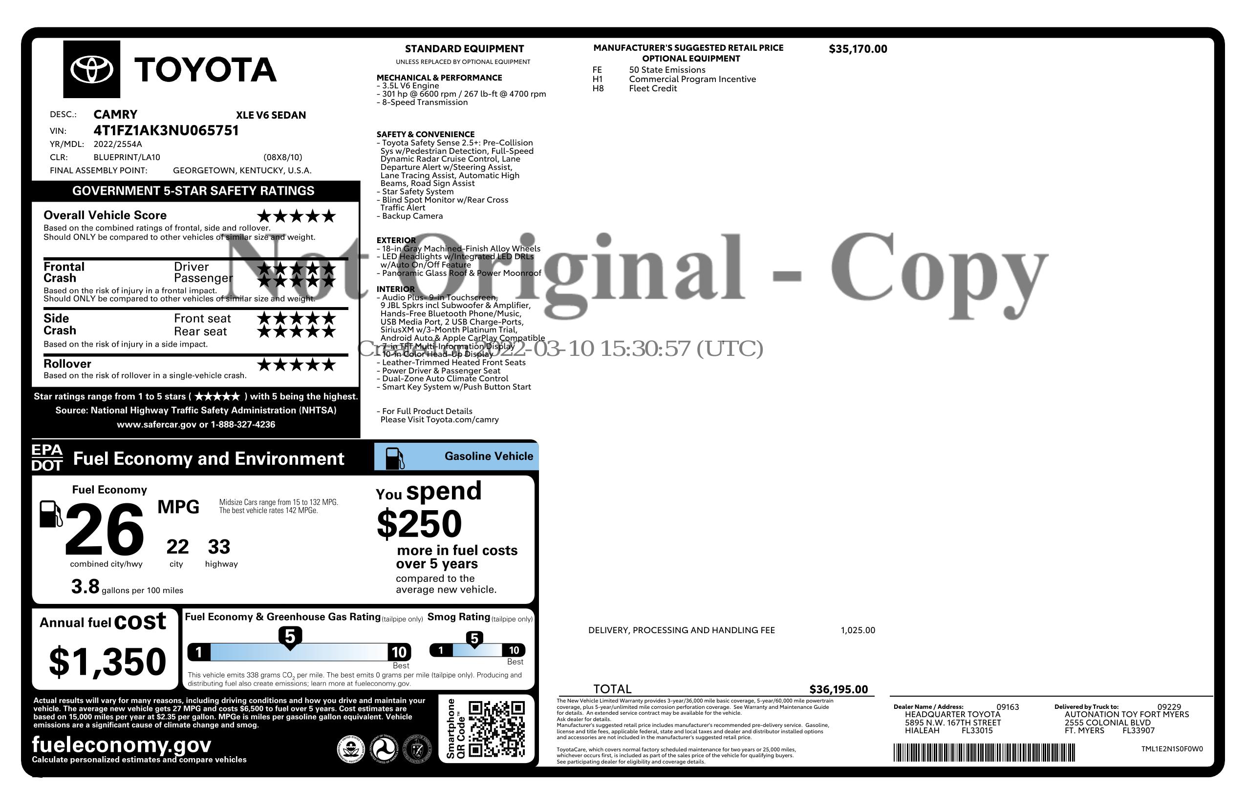 2022 Toyota Camry Xle V6 Auto (Natl)