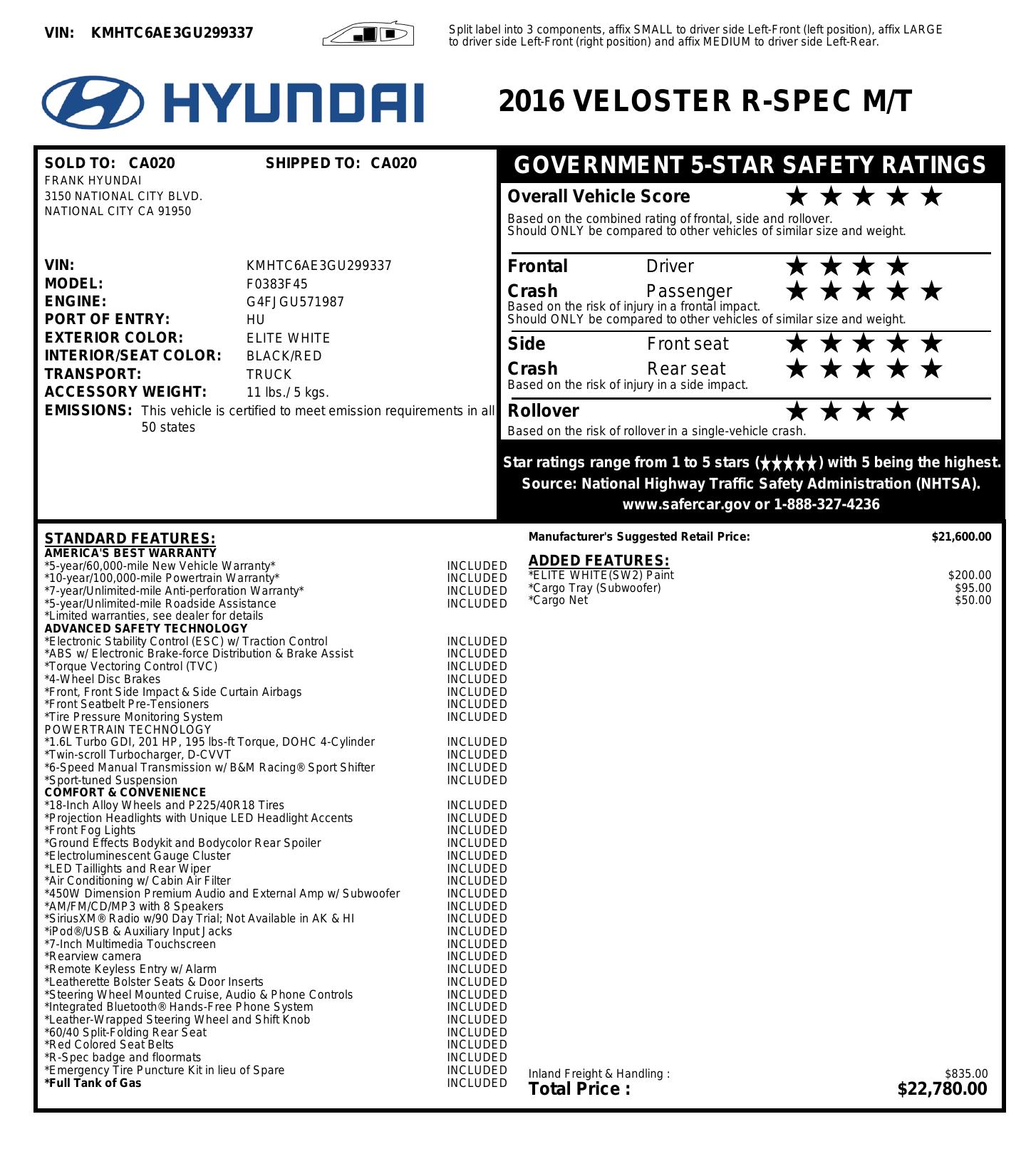 2016 Hyundai Veloster 3dr Cpe Man Turbo R Spec