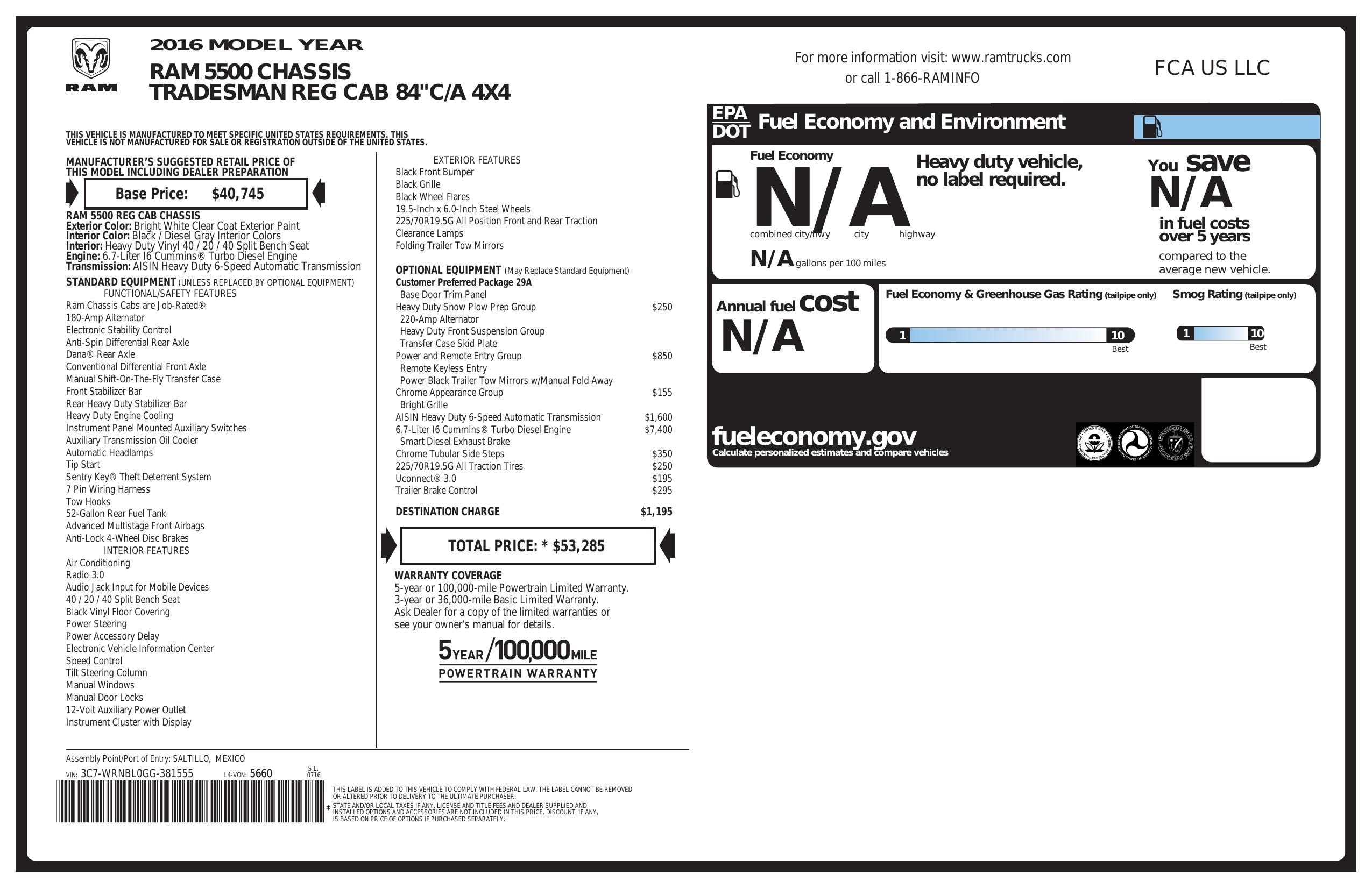 2016 Ram 5500 4 Wd Reg Cab 168" Wb 84" Ca Tradesman