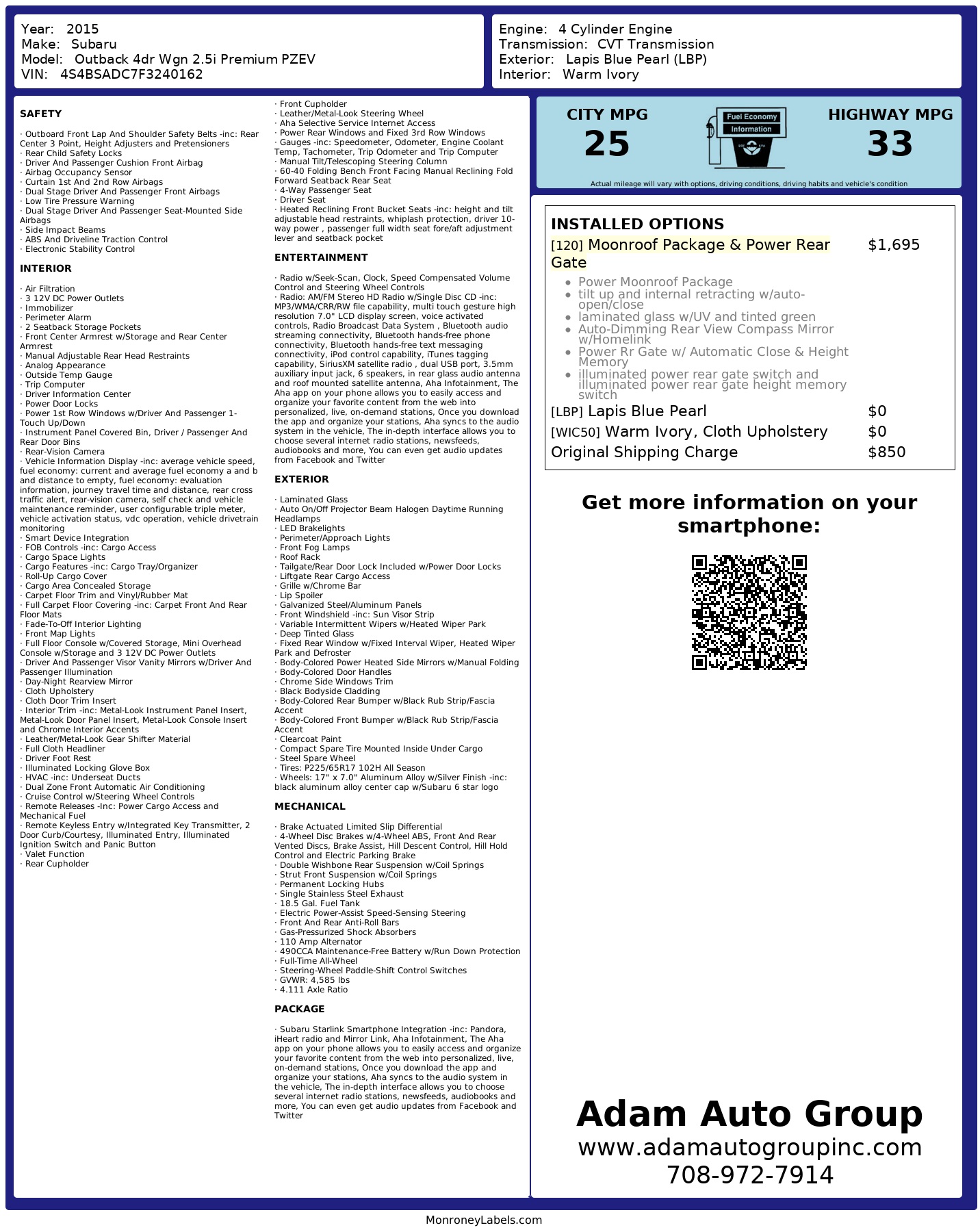 2015 Subaru Outback 4dr Wgn 2.5i Premium Pzev
