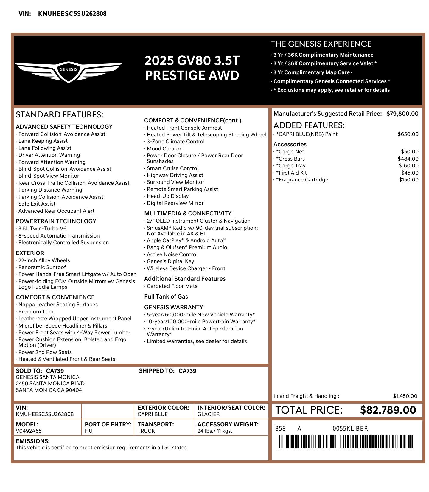2025 Genesis Gv80 Awd 3.5 T Prestige 4dr Suv