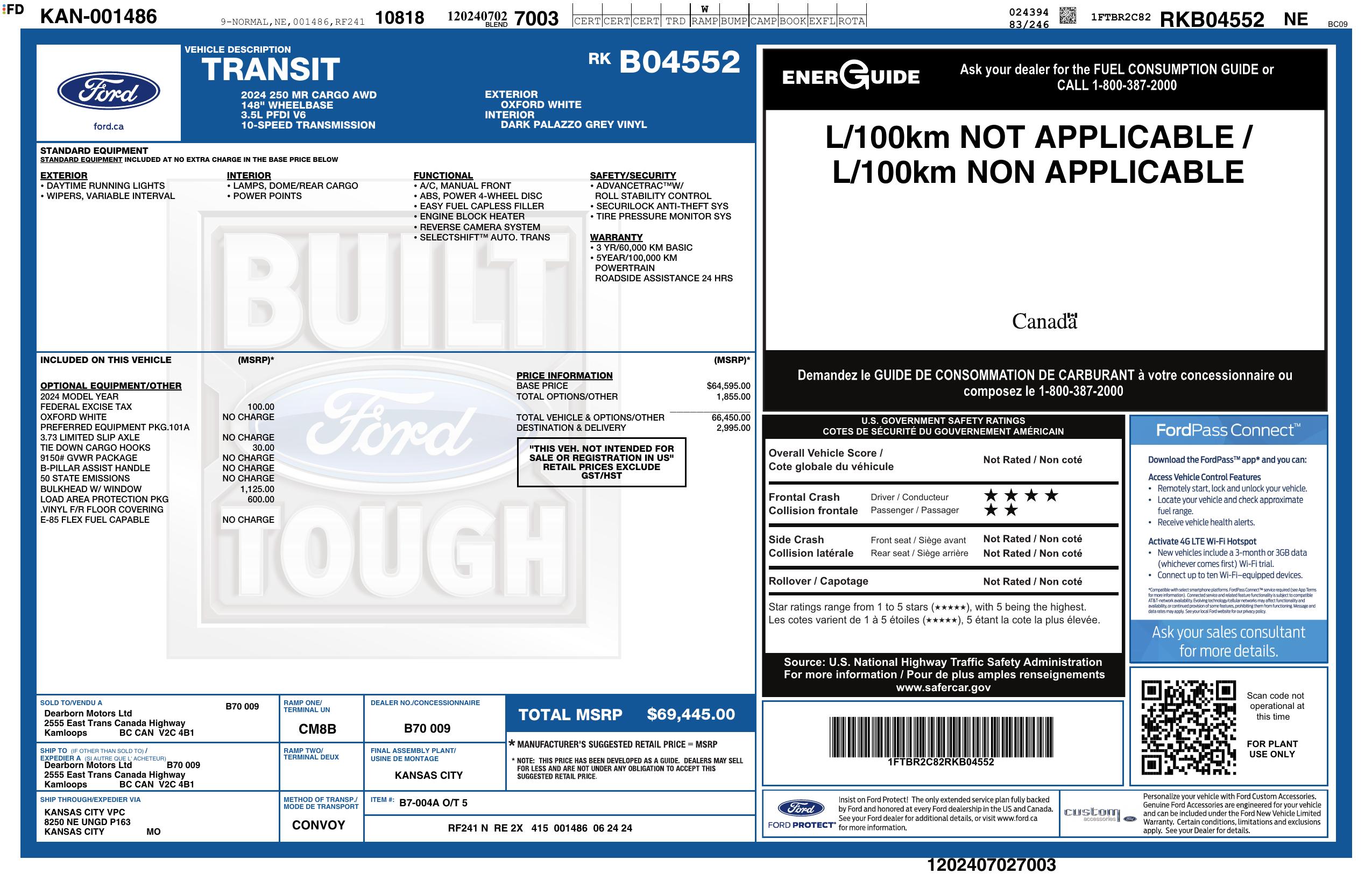 2024 Ford Transit Cargo Van T 250 148" Med Rf 9070 Gvwr Awd