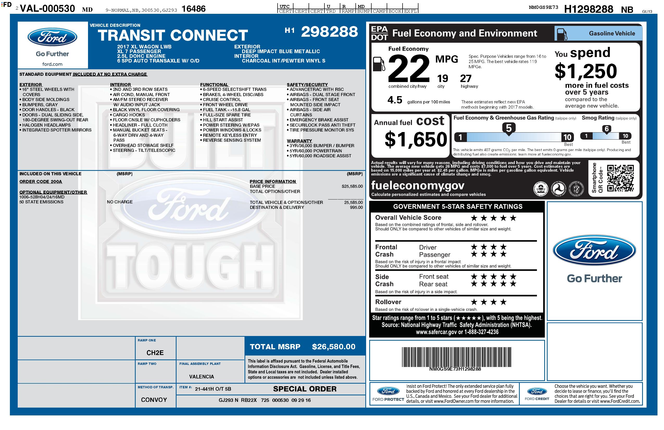 2017 Ford Transit Connect Wagon Xl Lwb W/Rear Symmetrical Doors