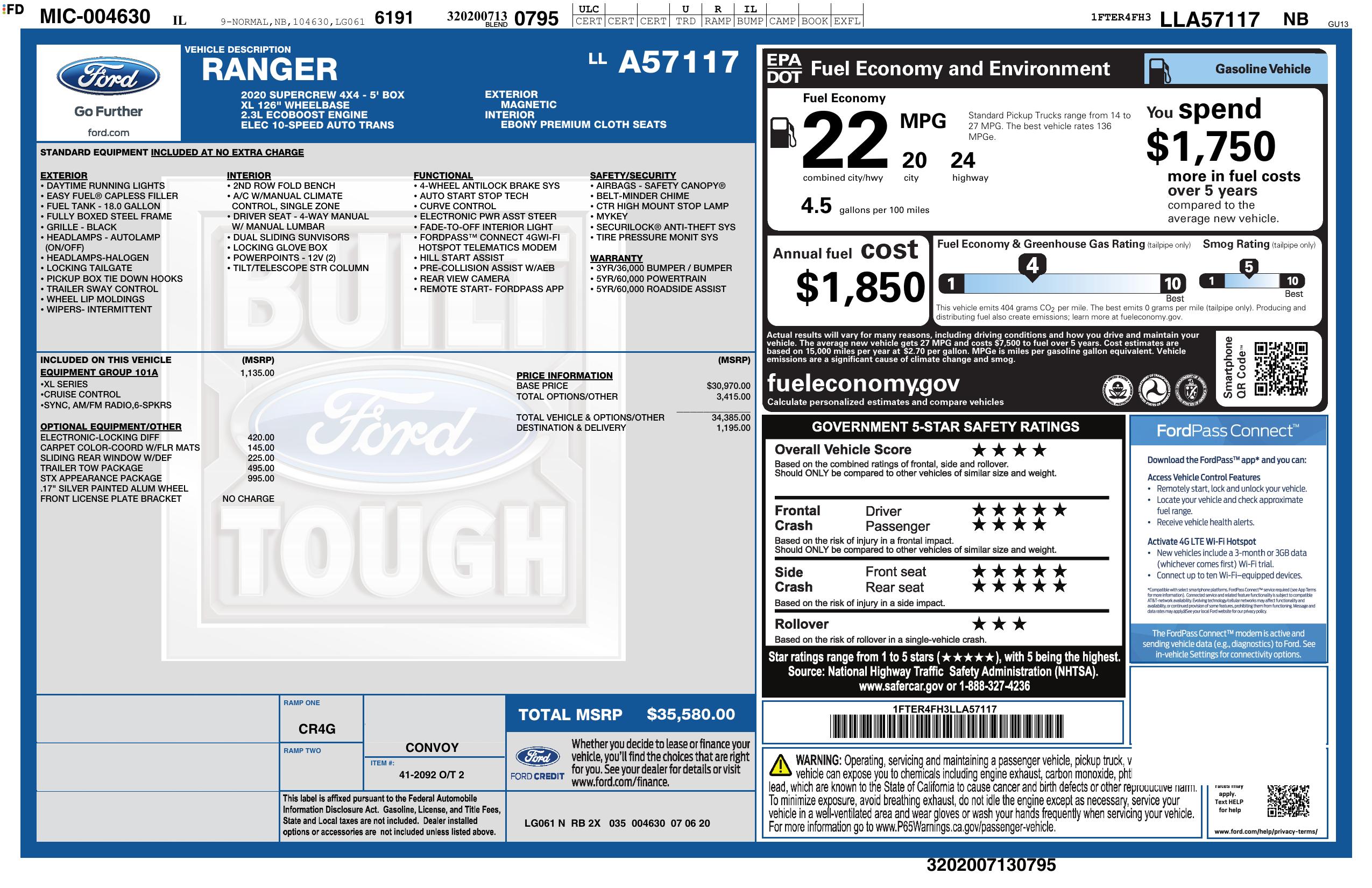 2020 Ford Ranger 4 Wd Super Crew 5' Box
