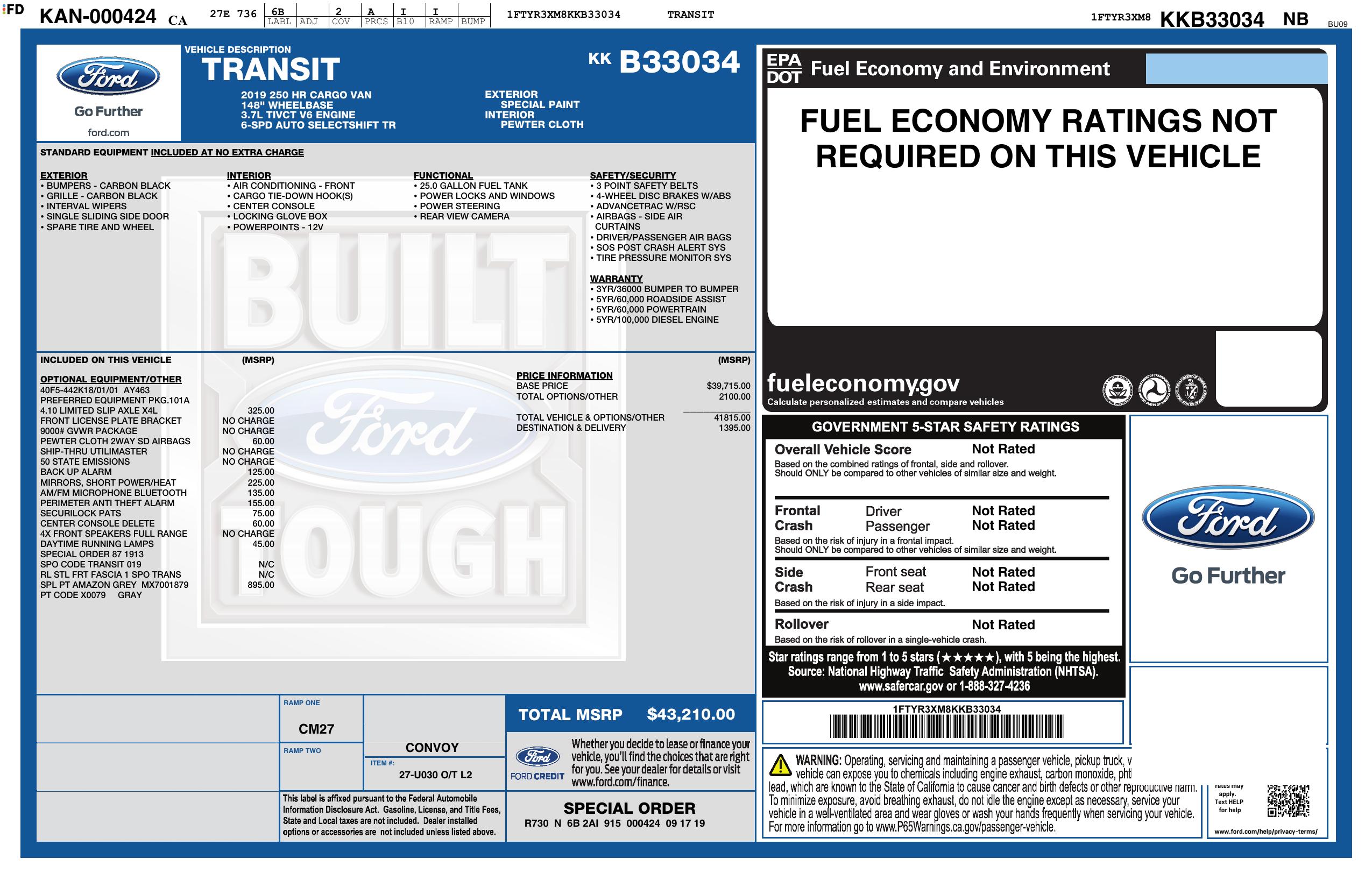 2019 Ford Transit Van T 250 148" El Hi Rf 9000 Gvwr Sliding Rh Dr
