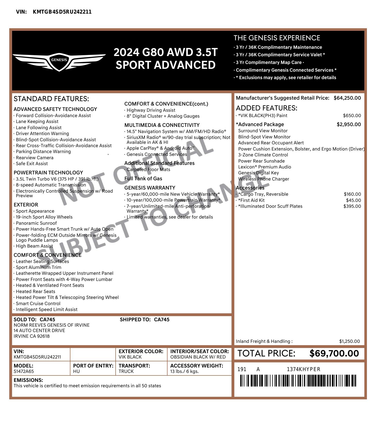 2024 Genesis G80 Awd 3.5 T Sport 4dr Sedan