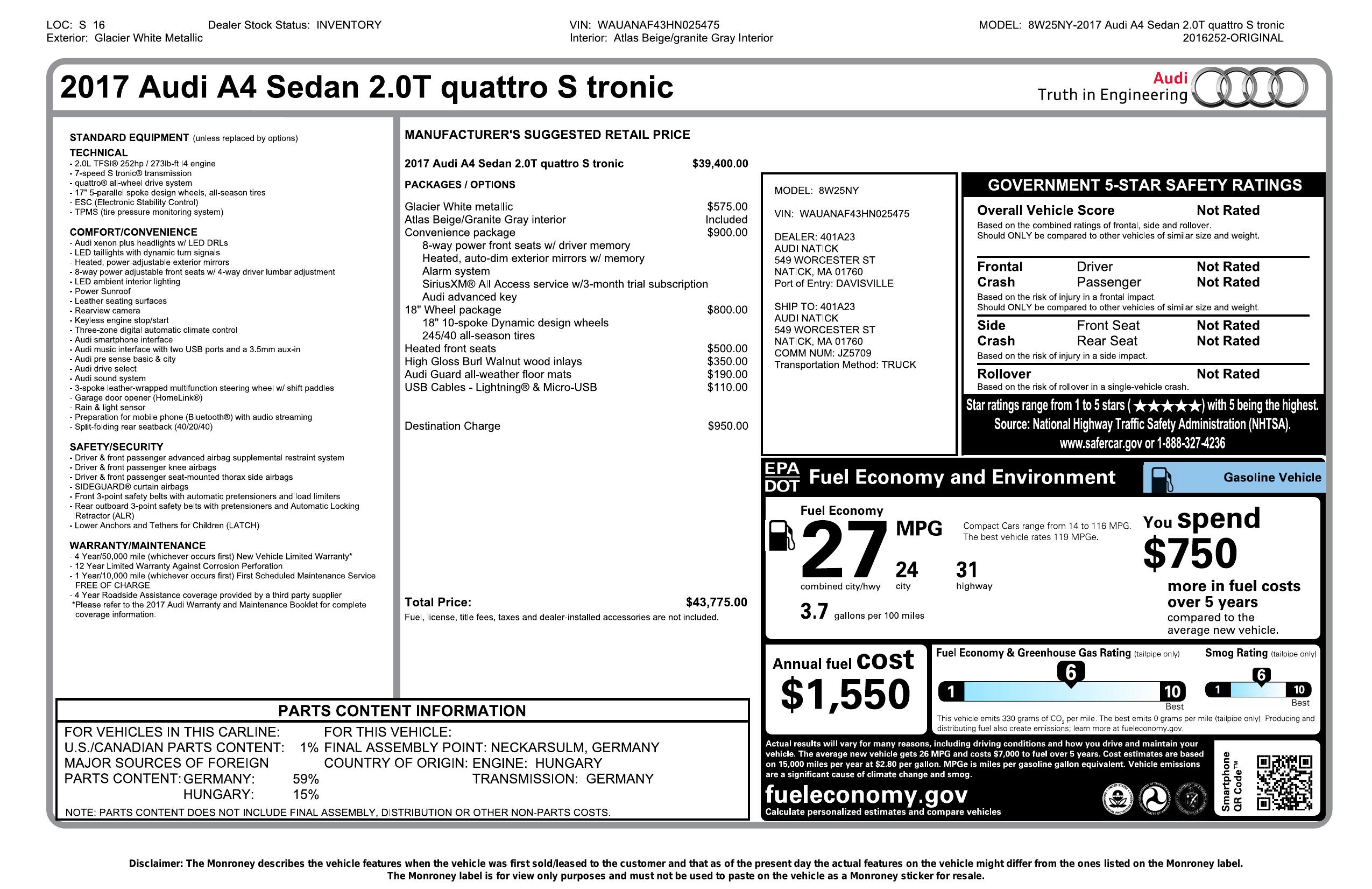 2017 Audi A4 2.0 Tfsi Auto Premium Quattro Awd
