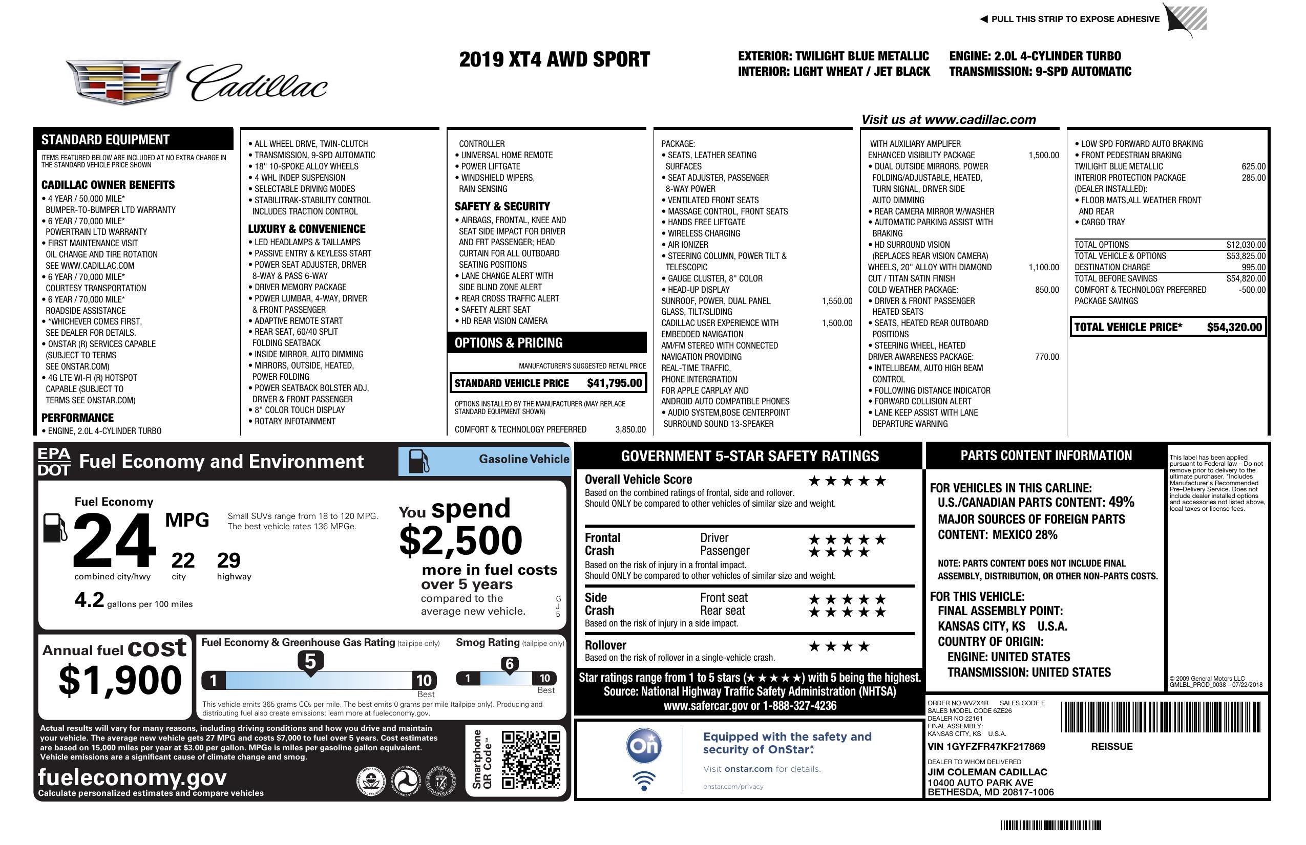 2019 Cadillac Xt4 Awd 4dr Sport
