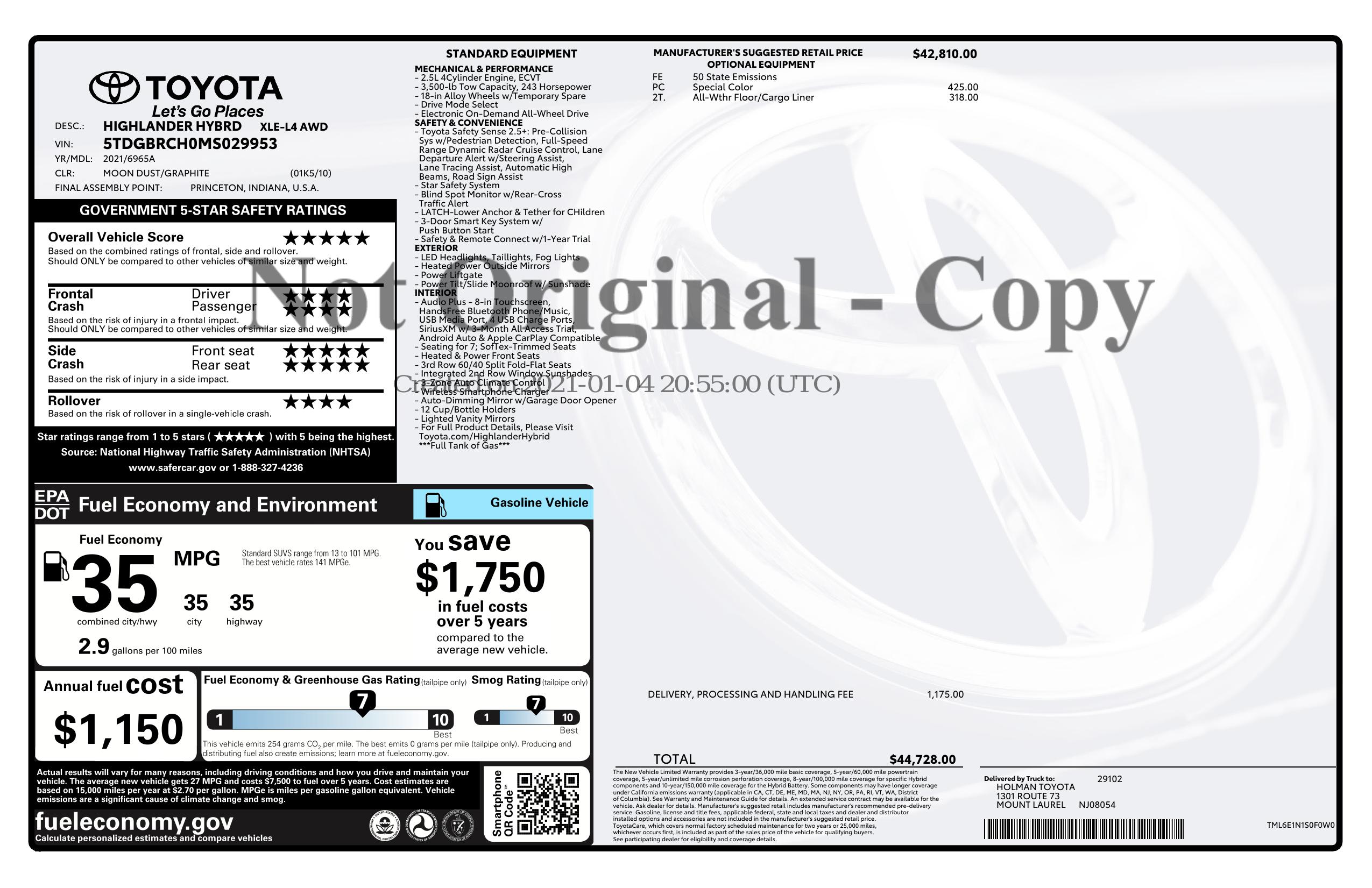 2021 Toyota Highlander Hybrid Xle Awd (Natl)