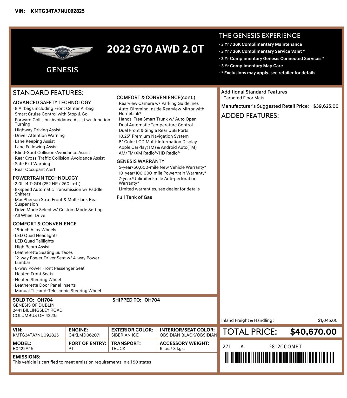 2022 Genesis G70 Awd 2.0 T 4dr Sedan