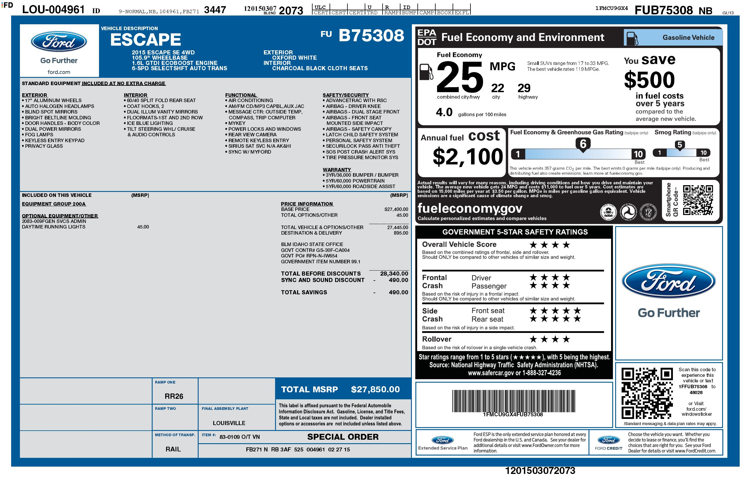 2015 Ford Escape 4 Wd 4dr Se