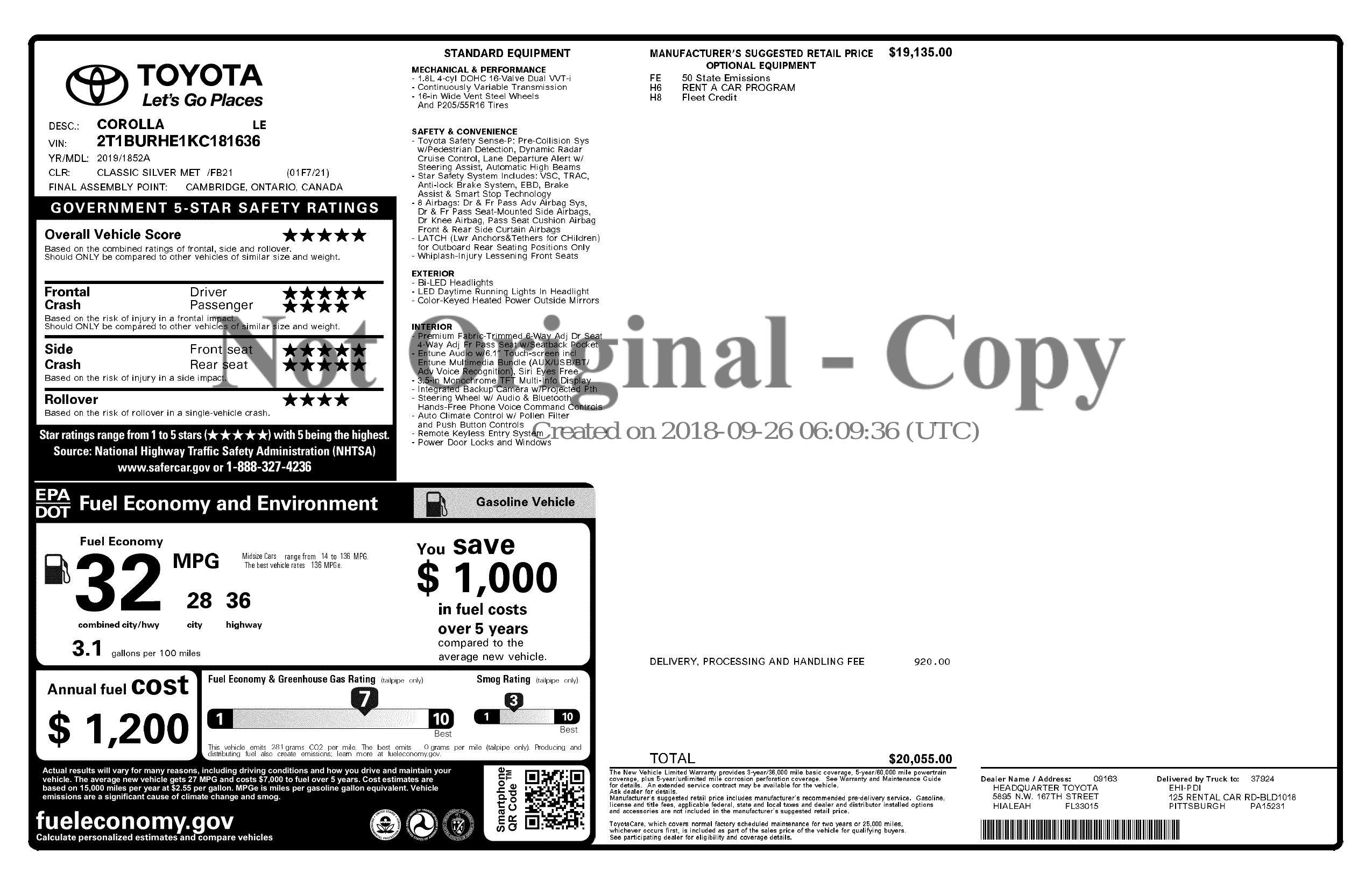 2019 Toyota Corolla (Natl)
