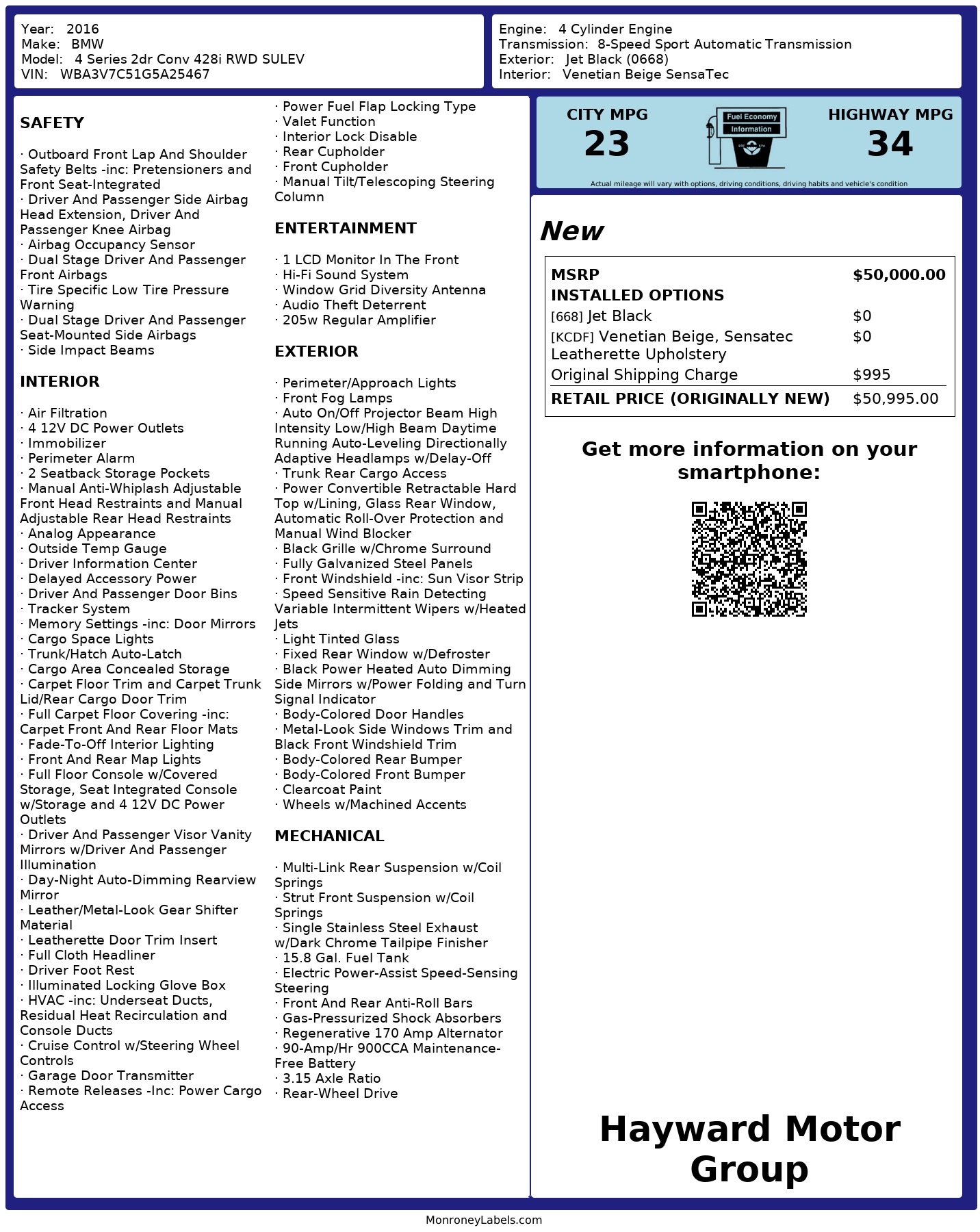 2016 BMW 4 Series 2dr Conv 428i Rwd Sulev