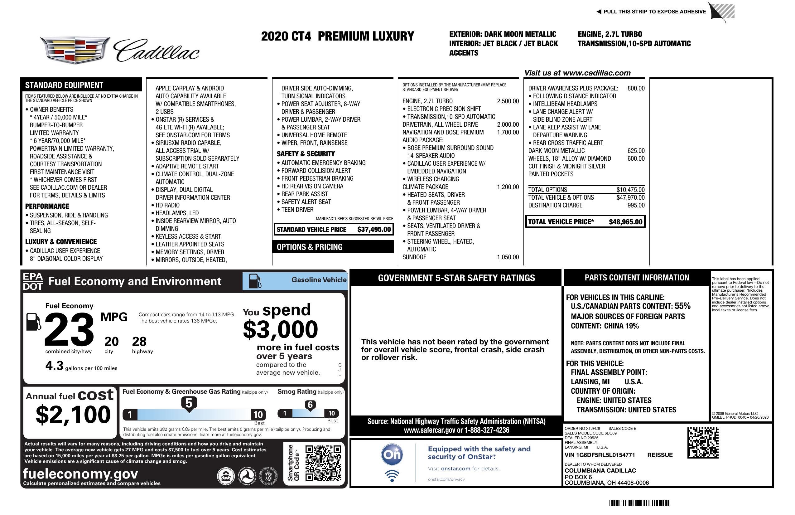 2020 Cadillac Ct4 4dr Sdn Premium Luxury