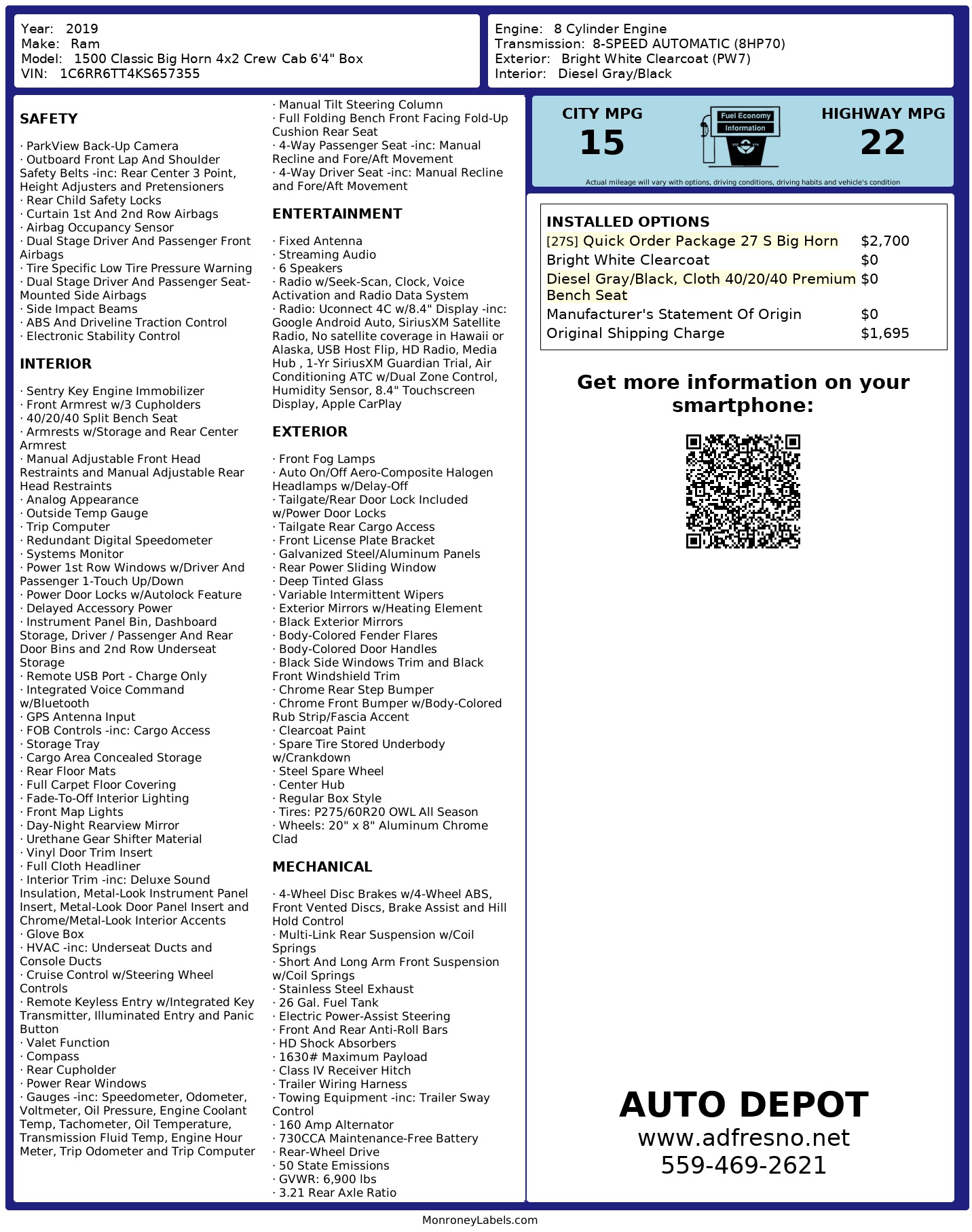 2019 Ram 1500 Classic Big Horn 4x2 Crew Cab 6'4" Box