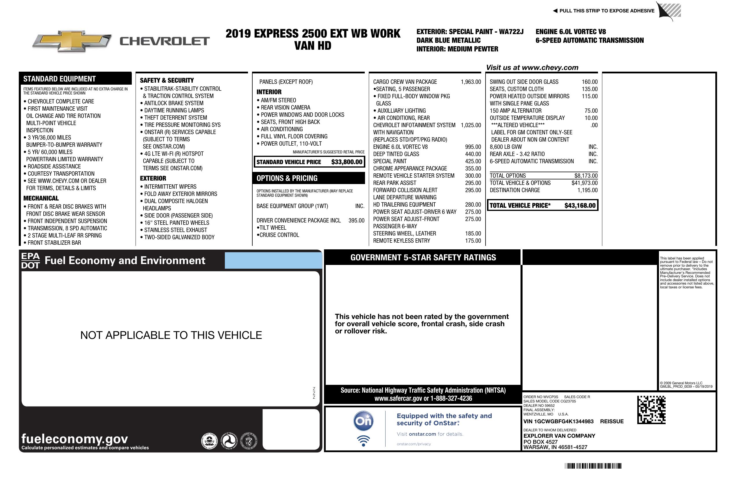 2019 Chevrolet Express Cargo Van Rwd 2500 155"