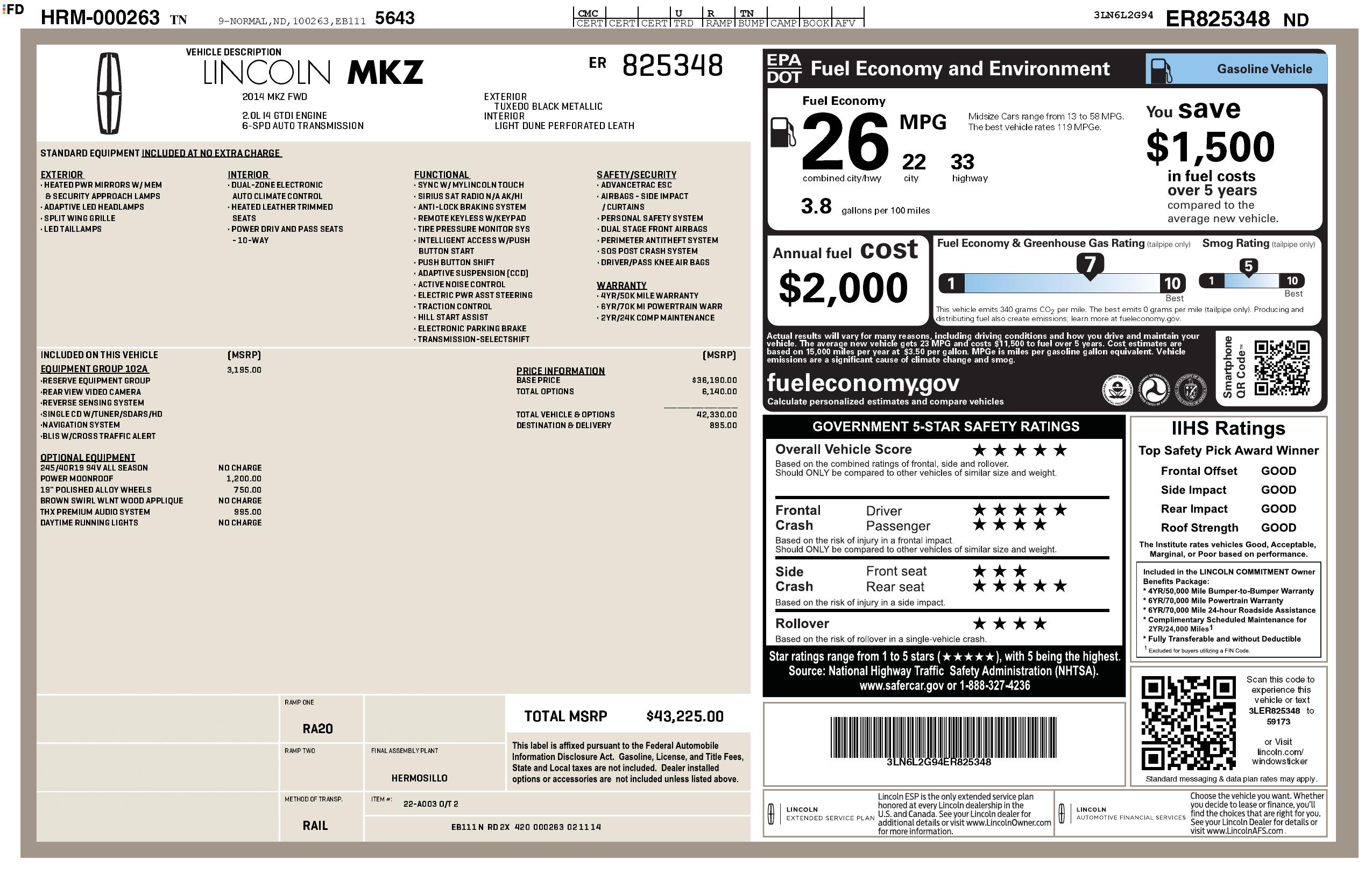 2014 Lincoln Mkz 4dr Sdn Fwd