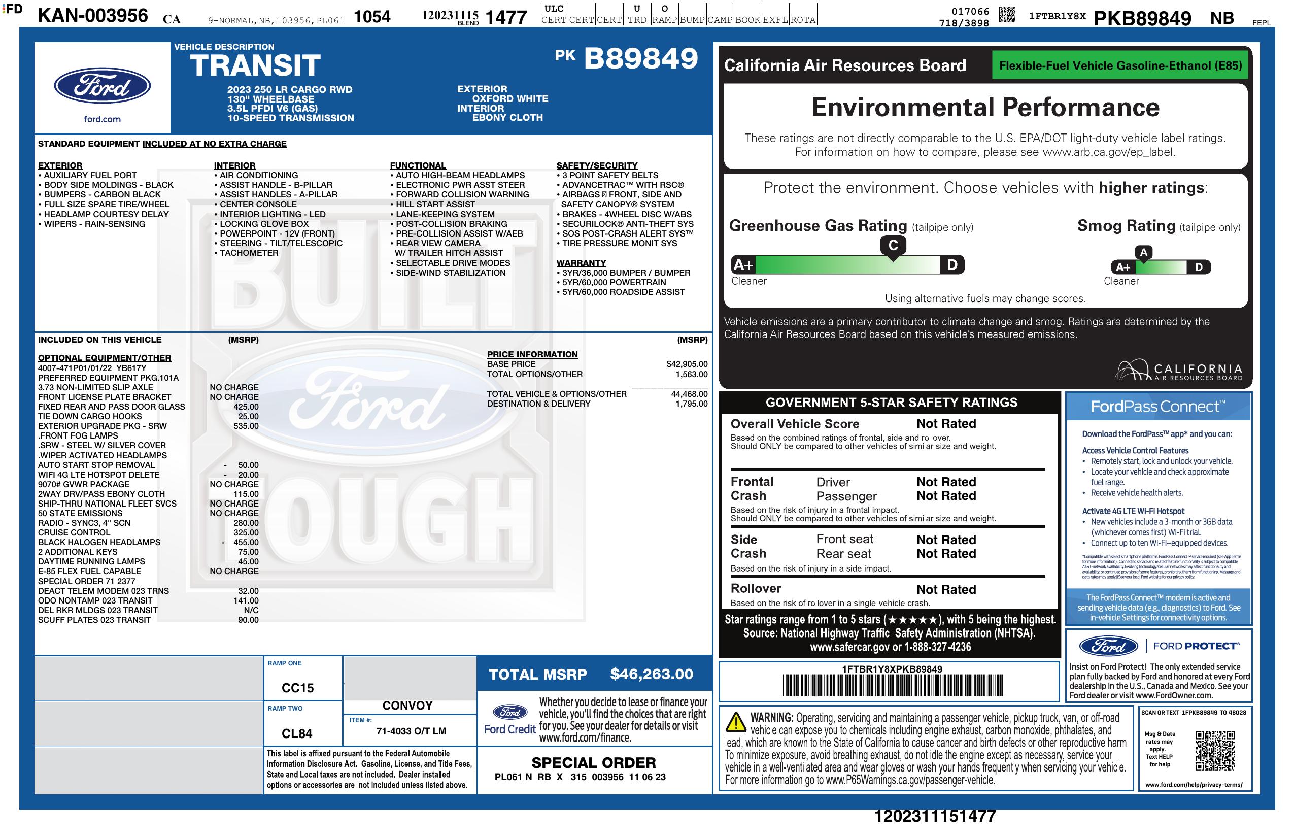 2023 Ford Transit Cargo Van T 250 130" Low Rf 9070 Gvwr Rwd