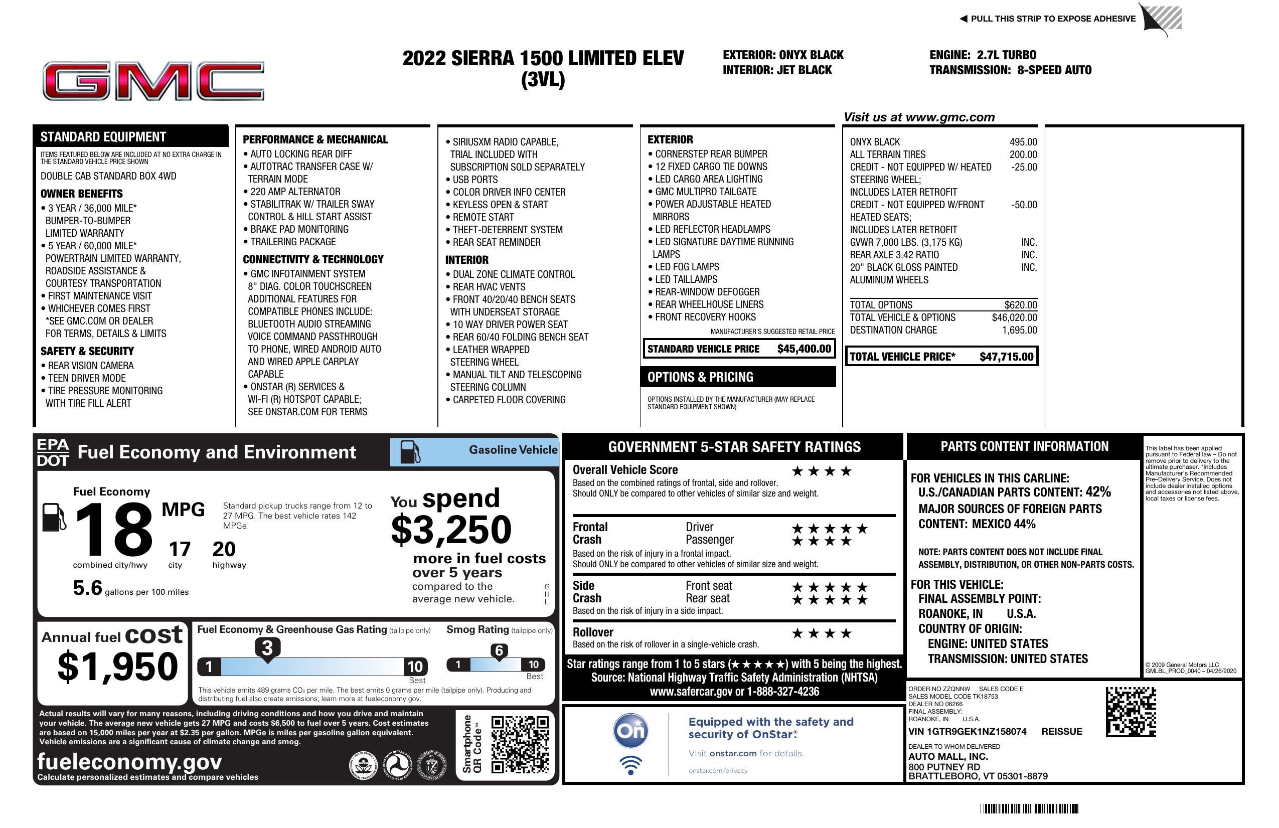 2022 GMC Sierra 1500 Limited 4 Wd Double Cab 147" Elevation W/3 Vl